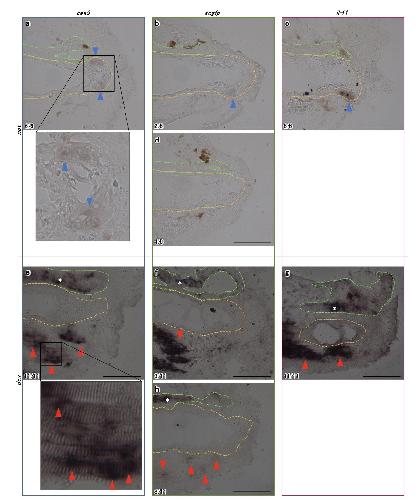 Supplementary Figure 8 Detailed localisation analysis of undifferentiated marker genes in il-11 KD tadpoles. a-d, WISH images for undifferentiated marker genes using cas9 mRNA-injected (a) or il-11 KD #1 (b-d) tadpoles that are not shown in Fig. 5. Representative WISH images for not (b), dcx (c), or runx1 (a and d) are shown. e-j, WISH images for undifferentiated marker genes using il-11 KD #2 tadpoles. Representative WISH images for not (e and h), dcx (f and i), or runx1 (g and j) are shown. k-q, Section images. Representative images for not (k), dcx (l, n and p), or runx1 (m, o and q) using cas9 mRNA-injected (k-m), il-11 KD #1 (n and o), or #2 (p and q) are shown. Anterior is to the left and dorsal is up. Blue/purple colour represents signals for each gene. Brown pigments are melanophores of the tadpoles. Scale bars: 500 μm (a-j) or 100 μm (k-q). Numbers at the bottom corner are the total ratio of tadpoles showing the corresponding expression from two batches. Green broken lines indicate spinal cord and spinal cord ampulla, and yellow broken lines indicate notochord and notochord bud. |