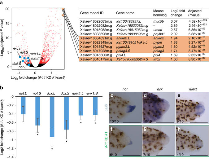 Figure 5. il-11 induces or maintains tissue progenitor cells across cell lineages during tail regeneration. a Gene expression profile of il-11 KD #1 and cas9 tadpoles. Left panel: volcano plot. Fold-change of expression level of il-11 KD #1 tadpoles over control tadpoles measured by RNA-sequencing are plotted on horizontal axis in log2 scale, and adjusted P-values are plotted on vertical axis in âlog10 scale. Genes with significant fold-changes (adjusted Pâ<â0.05) are plotted in red. Points beyond the range are plotted on the edge of the graph. Representative undifferentiated markers are plotted in blue. Right panel: top 10 genes which showed highest upregulation in il-11 KD #1 are listed. Mouse homologues of genes indicated in orange are reported to be selectively expressed in skeletal muscle in mice (Supplementary Fig. 7). These genes correspond to orange plots in the left panel. b Fold-change of expression levels of representative undifferentiated markers measured by RNA-sequencing. Meanâ±âs.e.m. nâ=â3. *adjusted Pâ<â0.05, Wald test. câh, Localisation of undifferentiated markers. Representative WISH images for not c, f, dcx d, g, or runx1 e, h in control câe or il-11 KD #1 tadpoles fâh are shown. Anterior is to the left, dorsal is up. Blue/purple colour represents signals for the genes. Brown pigments are melanophores of the tadpoles. Scale bars: 500âμm. Numbers at the bottom corner indicate the total ratio of tadpoles showing the corresponding expression pattern from two batches |