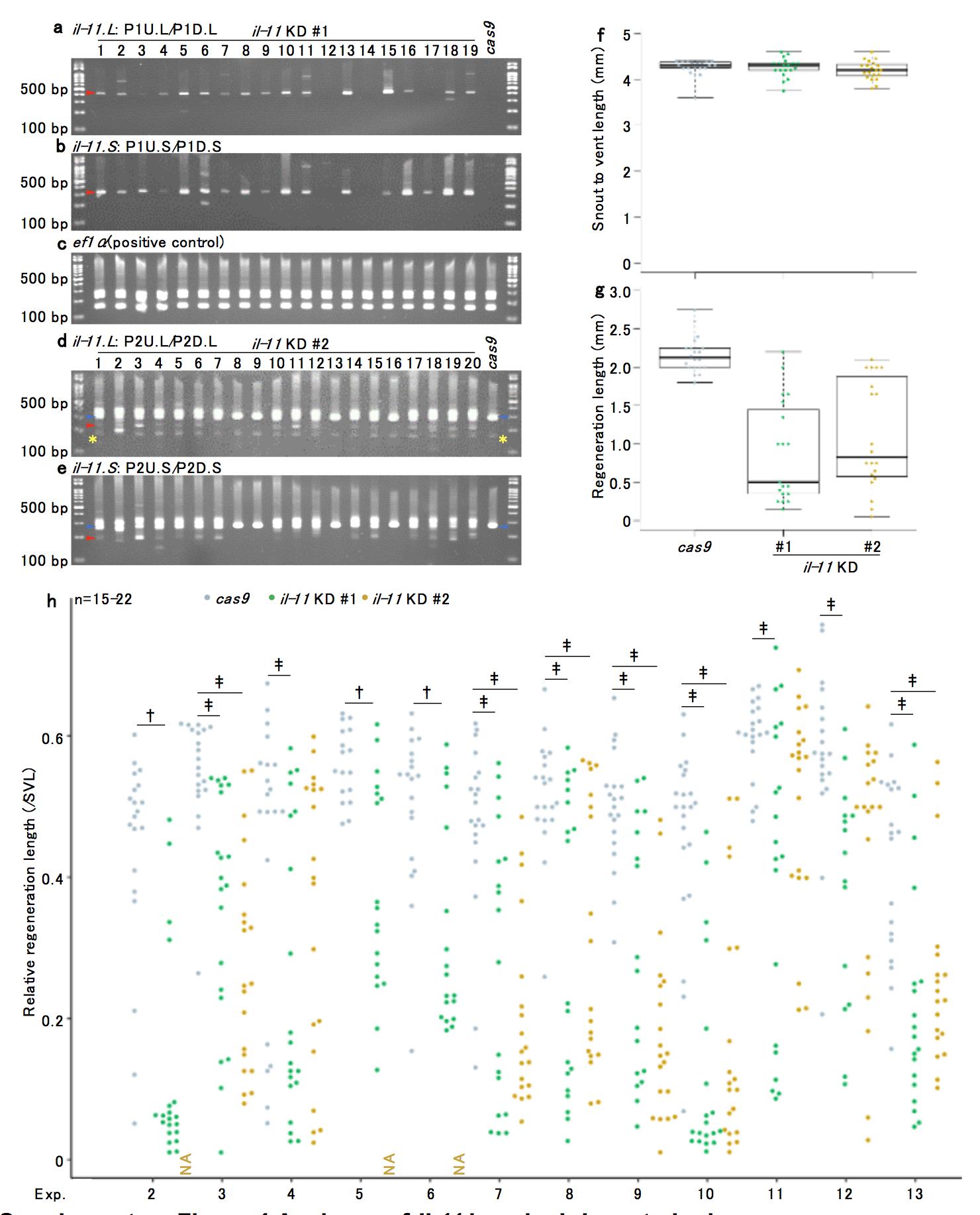Supplementary Figure 4 Analyses of il-11 knocked-down tadpoles. a-e, Genotyping of tadpoles used in Fig. 2i. Genomic DNA was extracted from tail stump tissues cut at the level 0.5 mm anterior from the amputated plane after measurement of regeneration length, and sequences corresponding to il-11.L (a, d), il-11.S (b, e), or positive control ef1a (c) were PCR-amplified. Individual identification numbers are indicated on top. Sizes of DNA markers were (from bottom to top) 100, 200, 300, 400, 500, 600, 700, 800, 900, 1000, 1500, and 3000 bp. If the genomic region between two gRNA target sites is deleted, a band will be detected as indicated by the red arrowhead. Blue arrowheads correspond to wild-type sequences. Yellow asterisks: non-specific bands. f, g, Snout to vent length (SVL, f) and regeneration length (g) used for calculation in Fig. 2i are shown. h, Biological replicates for Fig. 2i are shown. Different batches of tadpoles were used in each experiment (Exp.). Box plots are inserted in the panels. Bars in the boxes represent median, upper and lower limits of the boxes represent the first and third quartiles, and whiskers represent maximum and minimum values. â P < 0.05, Studentâs t-test. â P < 0.05, Dunnettâs test. NA: not analysed. |