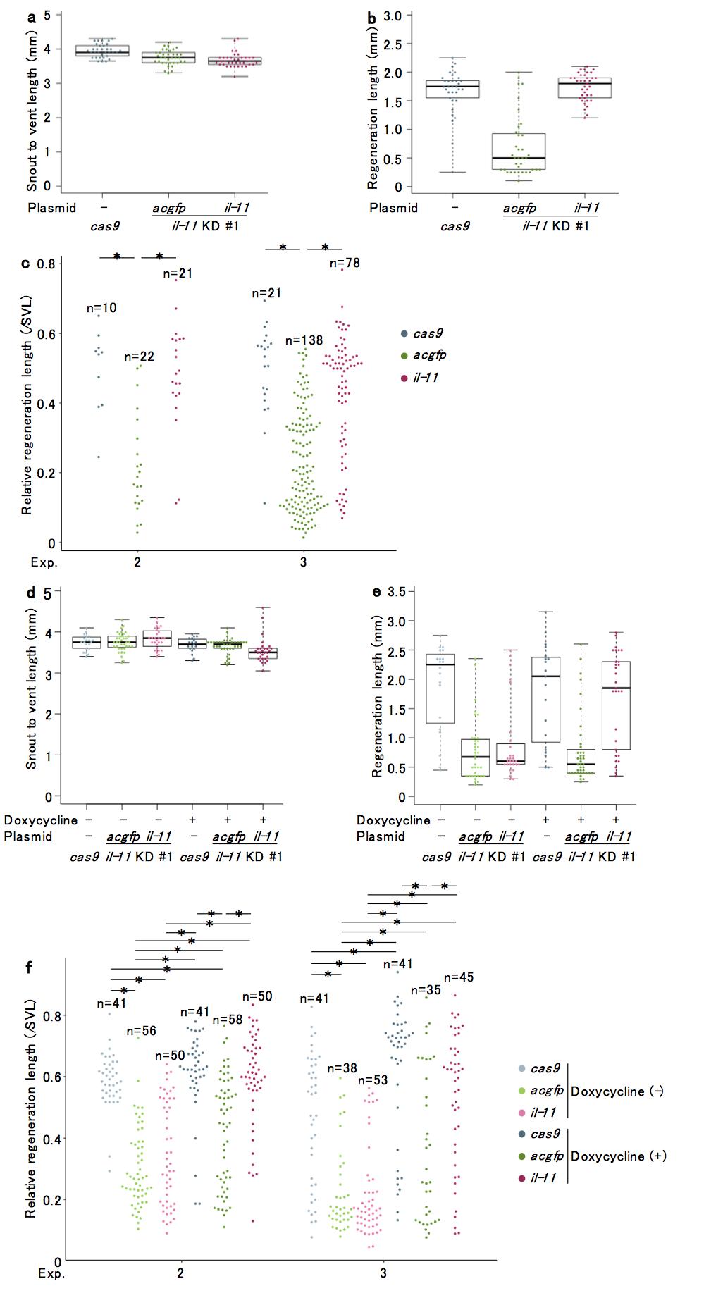 Supplementary Figure 5 Analyses of il-11 forced expressed il-11 knocked-down tadpoles. a, b, d, e, Snout to vent length (SVL, a, d) and regeneration length (b, e) used for calculation in Fig. 3j (a, b) or Fig. 3x (d, e) are shown. c, f, Biological replicates for Fig. 3j (c) or Fig. 3x (f) using different batches of tadpoles are shown. Box plots are inserted in the panels. Bars in the boxes represent median, upper and lower limits of the boxes represent the first and third quartiles, and whiskers represent maximum and minimum values.*P < 0.05, Tukey-Kramerâs test. |