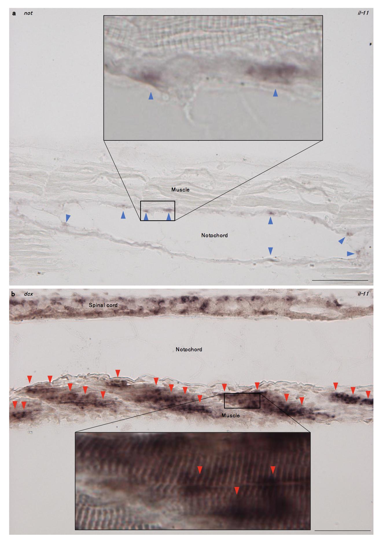 Supplementary Figure 11 Localisation of cells expressing undifferentiated markers in tadpoles with forced expression of il-11. Biological replicates for Fig. 6l and o. Representative ISH images for not (a) or dcx (b) in il-11-expressing intact tadpole tails 2 days after doxycycline treatment are shown. Several not-expressing cells in the notochord sheath (blue arrowheads), and dcx-expressing muscle (red arrowheads) were detected. Scale bars: 100 μm. Anterior is to the left, dorsal is up. Magenta/purple colour represents signals for the genes. Inset: magnified view of boxed area. |