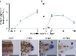 Figure 1. il-11 is expressed at the tip of blastema during tail regeneration. a, b Expression levels of il-11 were measured by qRT-PCR using RNA extracted from ~20 tadpoles. Tail stump tissues cut at the level of 0.5âmm anterior from the amputated plane were used. Vertical axes represent relative expression levels of il-11 normalised by those of ef1α. Meanâ±âs.e.m. nâ=â4. ND: not detected. câf WISH was performed using tadpoles fixed at 0 c, 24 d, 72 e, or 120âhpa f. Anterior is to the left and dorsal is up. Blue/purple colour represents signals for il-11 expression. Brown pigments are melanophores of the tadpoles. Scale bars: 500âμm. Numbers at the bottom corner indicate the total ratio of tadpoles showing the corresponding expression pattern from at least two batches. Note that il-11 was expressed at the blastema tip at 72 and 120âhpa (black arrowheads) |