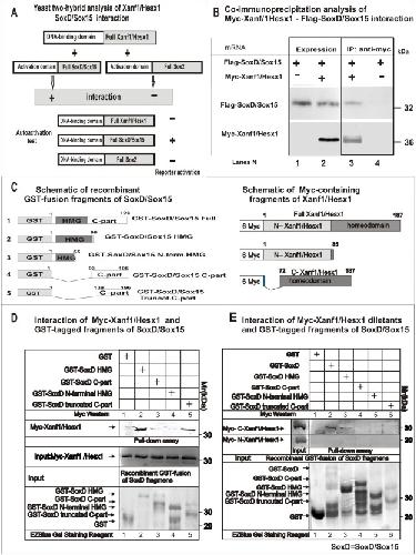 (D) In vitro complex formation between Myc-Xanf1/Hesx1 and GST-hybrid fragments of the SoxD/Sox15 factor.