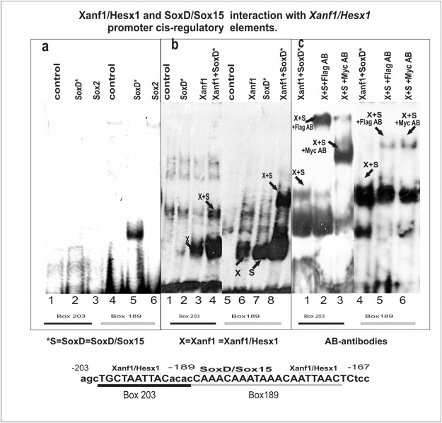 Lines 1–3: Box 203 regulatory element with (1) Myc-Xanf1/Hesx1 + Flag-SoxD/Sox15 containing embryo lysates; (2) reaction mixture with anti-Flag monoclonal antibodies and (3) reaction mixture with anti-Myc monoclonal antibodies.