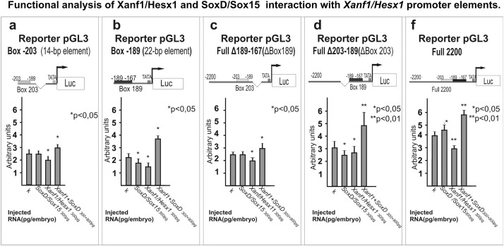 Fig. 3. The effect of Xanf1/Hesx1 + SoxD/Sox15 complex formation on expression of the reporter gene (luciferase) under control of the regulatory elements of the Xanf1/Hesx1 promoter.