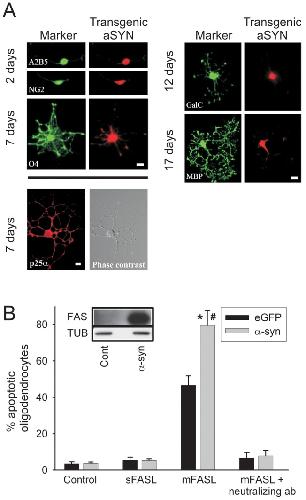 In vitro differentiation of (PLP)-α-syn tg oligodendrocytes. Oligodendrocyte progenitor cells were isolated from tg mouse forebrains and cultured for the indicated times. Cells were fixed for double-label immunostaining with antibodies against A2B5, NG2, O4, GalC and MBP (green; left panels) as well as monoclonal 15G7 against human α-syn (red; right panels). Differentiated cells (7 DIV) were immunostained with an antibody against p25α and visualized by phase contrast microscopy. Scale bars, 10 µm. B, Human α-syn and eGFP tg oligodendrocytes were treated for 24 h with DMSO (control), sFASL, mFASL or preincubated for 30 min with FAS-blocking antibody before challenge with mFASL. Cells were fixed and labeled with O4 and Hoechst. mFASL treatment induced oligodendrocyte cell death as determined by apoptotic nuclei with α-syn oligodendrocytes being significantly more sensitive to FAS mediated cell death than eGFP oligodendrocytes. Data represent mean ± SEM of total tg oligodendrocytes from three independent experiments. Student t test (nâ=â3): *p<0.0001 compared with untreated cultures; #p<0.001 compared with eGFP tg cultures exposed to the same challenge. Western blots prepared from lysates of wild-type and α-syn tg oligodendrocyte cultures were sequentially probed with monoclonal anti-FAS and anti-α-tubulin antibodies (insert).