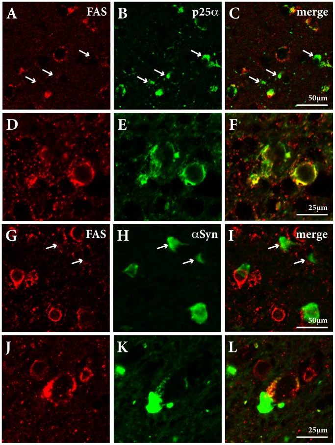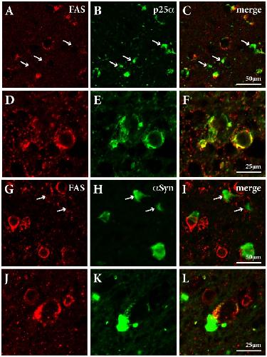 Figure 4. FAS colocalizes with p25α and α-synuclein in human MSA brain.Double labeling immunofluorescence using FAS (red) and p25α (green) antibodies (A–F) and FAS (red) and α-syn (green) antibodies (G–L) in putamen of an MSA case. Protein colocalization is shown as yellow in merged images (C, F, I, L). A–C, Identification of p25α-positive/FAS-negative GCIs (arrows) in oligodendroglia. D–F, Colocalization of FAS and p25α within GCI-like structures but not in small punctate cytoplasmic granules. G–L, FAS and α-syn colocalized in 4% of the GCIs (J–L) but the majority of α-syn-positive GCIs did not colocalize FAS (G–I, arrows indicate α-syn-positive/FAS-negative inclusions).