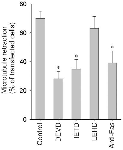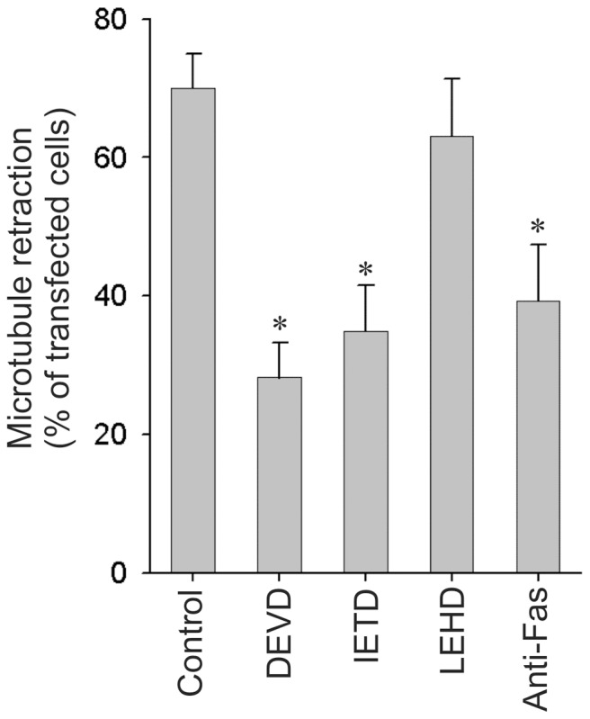 Figure 1. α-synuclein dependent degeneration in OLN-93 cells requires FAS signaling and caspase-8 activation.OLN-t40-AS cells stably expressing human α-syn were treated with peptide aldehyde inhibitors (20 µM) against caspase-3 (Ac-DEVD-CHO), caspase-8 (Ac-IETD-CHO), caspase-9 (Ac-LEHD-CHO) and FAS-blocking antibody (ZB4) (1 µg/ml) 1 h prior to transfection with p25α. MT retraction was quantified my immunofluorescence microscopy 24 h after transfection. Bars represent the mean ± standard error of mean (SEM) from three independent experiments. Inhibition of caspase-3, caspase-8 and FAS but not caspase-9 caused a significant reduction in MT retraction as compared with the control cells (p<0.05 with respect to untreated cells).