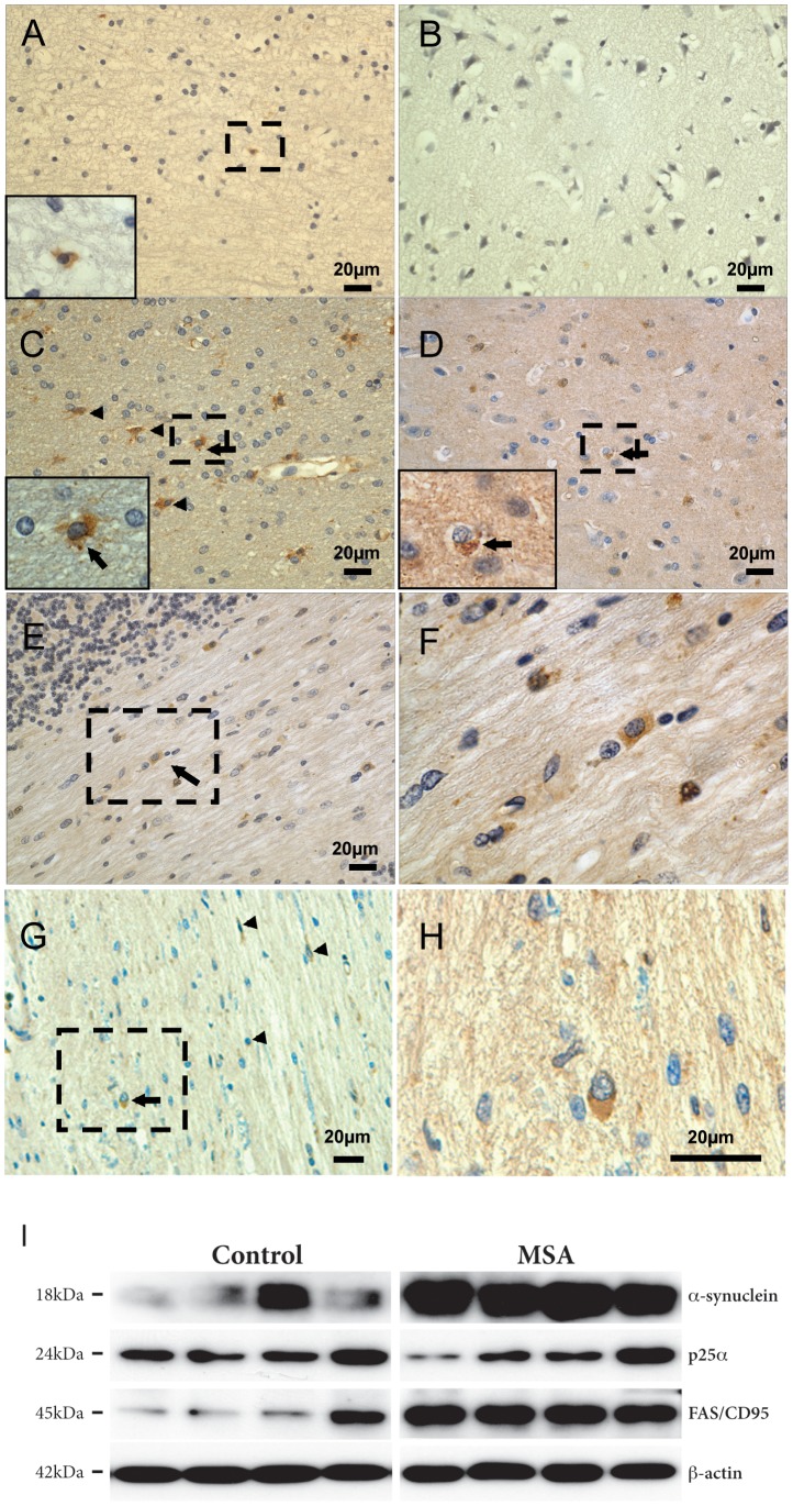 B, Immunohistochemical staining for FAS in normal controls. In normal controls there were only occasional FAS-positive cells shown here in (A) the inferior temporal cortical white matter and (B) grey matter. Insert in (A) shows a FAS-positive cell resembling a microglia. CâH, Immunohistochemical staining for FAS in MSA cases. MSA tissue contained numerous FAS-positive glial cells shown here in the inferior temporal cortical (C) white matter and (D) grey matter. Arrows indicate FAS-positive oligodendrocytes, and arrowheads indicate FAS-positive astrocytes or microglia. Inserts in (C) and (D) shows enlarged view of boxed regions showing FAS-positive oligodendrocytes (judged by their nuclear morphology). The oligodendrocyte in (D) contains an inclusion. E, FAS-positive glial cells in the cerebellar white matter. Boxed region in (E) is enlarged in (F) showing oligodendrocytes. G, FAS-positive cells in the pons. Arrow indicates a FAS-positive glial cell resembling a GCI-bearing oligodendrocyte. Arrowheads indicate FAS-positive astrocytes and microglia. Boxed region in (G) is enlarged in (H). I, Braintissue (precentral gyrus white matter) from human MSA (nâ=â8) and control cases (nâ=â10) was sequentially extracted for TBS and SDS soluble proteins and the SDS soluble fraction were used for further analysis. Four MSA and four control cases are shown. Proteins (20 μg) were resolved by SDS-PAGE and analyzed by immunoblotting using antibodies against α-syn, p25α and FAS. Actin was included as a loading control. The molecular sizes (kDa) of the presented bands are indicated to the left. There was a significant increase in SDS-soluble FAS protein in MSA cases compared to controls (pâ=â0.043).