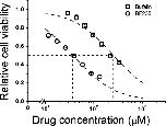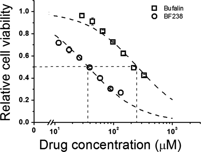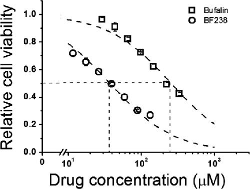 Fig. 1. Dependence of viability of RH-35 cells on concentration of bufalin (open squares) and BF238 (open circles). Data represent averages + SEM (N=3). Dashed lines are approximations of euq. 1 with n=1, Y0=1, yielding IC50 values of 257.0 and 37.4 µM for bufalin and BF238, respectively.