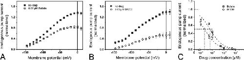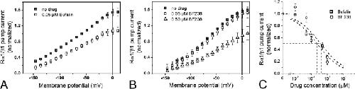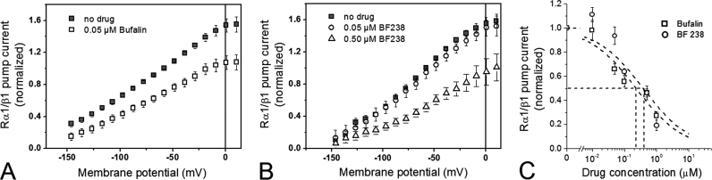 Fig. 4. Dependencies of Na+,K+pump current in oocytes with additionally expressed rat Rα2/ß1 pumps. (A, B) Current-voltage dependencies in the absence (filled squares) and during application of 0.05 and 0.5 µM bufalin (open squares and circles) and 0.05 and 0.5 µM BF 238 (open circles and rhombs). Data represent averages of N=6 oocytes + SEM. (C) Concentration-dependent inhibition of endogenous Na+,K+pump current by bufalin (open squares) and BF238 (open circles). Data represent averages of 5–10 measurements + SEM. Solid lines are fits of euq. 1 with n=0.8, yielding IC50 values of 2.558 and 0.987 µM, respectively (compare dashed lines).