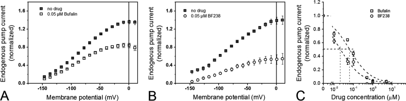 Fig. 2. Dependence of endogenous Na+,K+pump current on concentration of bufadienolides. (A, B) Current-voltage dependencies in the absence (filled squares) and during application of 0.05 µM bufalin (open squares) and 0.05 µM BF238 (open circles), respectively. Data represent averages of N=5 oocytes + SEM. (C) Concentration-dependent inhibition of endogenous Na+,K+pump current by bufalin (open squares) and BF238 (open circles). Data represent averages of 5–10 measurements + SEM. Dashed lines are fits of euq. 1 with n=0.81, yielding IC50 values of 0.063 and 0.021 µM, respectively (compare dashed lines).