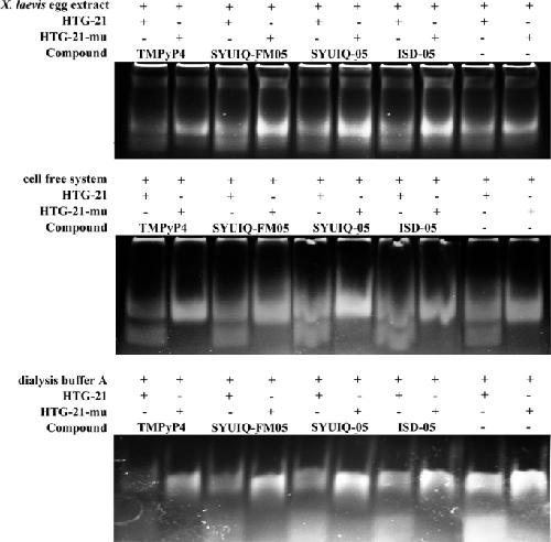 Fig. 7. Gel electrophoresis of HTG21 in ionic buffer [10 mM Tris–HCl buffer (pH 7.4) containing 110 mM KCl], cell free system, Xenopus laevis egg extract, and control system (the dialysis buffer containing 40% PEG).