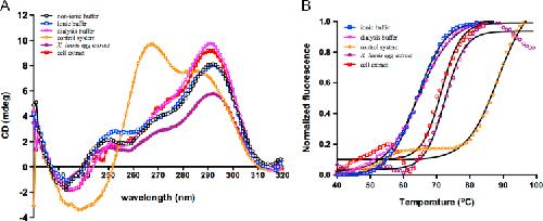 Fig. 2. (A), CD spectra of 5 μM HTG21 oligomer in non-ionic buffer (10 mM Tris–HCl buffer, pH 7.4), ionic buffer [10 mM Tris–HCl buffer (pH 7.4) containing 110 mM KCl], dialysis buffer, control system (dialysis buffer with 40% PEG), Xenopus laevis egg extract, and cell-free system (dialysis buffer with cell extract). (B), The FRET melting curves of HTG21G-quadruplex in ionic buffer, dialysis buffer, cell-free system, X. laevis egg extract, and control system.