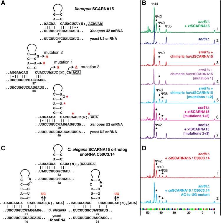 FIGURE 3. Pseudouridylation of yeast U2 snRNA induced by Xenopus SCARNA15 and by the C. elegans ortholog, snoRNA C50C3.14. (A,C) Predicted base-pairing between SCARNA15 and Xenopus U2 snRNA (A) or C. elegans U2 snRNA (C). The equivalent yeast U2 snRNA sequences are shown below. Mutated nucleotides are highlighted in red. (B,D) Fluorescent primer extension reactions. (B) Traces 1 (green) and 2 (blue): Wild-type Xenopus SCARNA15 modifies yeast U2 snRNA at positions 42 and 40 when expressed in the snr81Δ mutant yeast strain. Trace 3 (red): Chimeric SCARNA15 (human 5′ terminal hairpin and Xenopus 3′ terminal hairpin) modifies only position 40 of yeast U2 snRNA. Trace 4 (violet): Mutation 1 alone did not change pseudouridylation of position 38. Traces 5 (light blue) and 6 (magenta): A combination of mutations 1 and 2 is required to make the Xenopus 3′ terminal pseudouridylation pocket functional at position 38 in U2 snRNA. Trace 7 (dark violet): Mutation 3 makes the 3′-terminal domain of Xenopus SCARNA15 nonfunctional on yeast U2 snRNA; only the 5′ terminal pocket functions to position Ψ42. Stars indicate induced modifications. (D) Traces 1 (red) and 2 (blue): Both wild-type (red) and mutant C. elegans SCARNA15 (blue) are fully functional at all three predicted positions in yeast U2 snRNA: Ψ42, Ψ40, and Ψ38 (stars). |