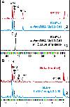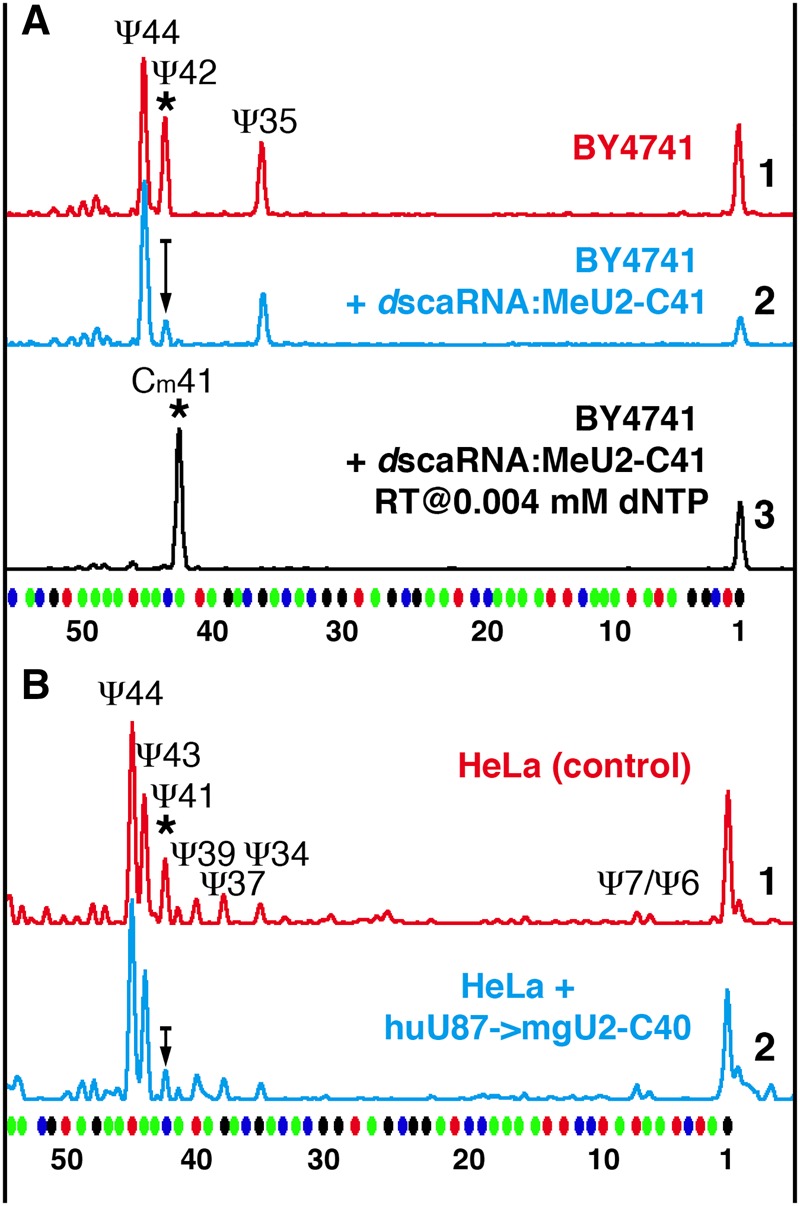 FIGURE 7. Prior 2′-O-methylation of a position in the branch point recognition region inhibits pseudouridylation of the following position. Fluorescent primer extension reactions. (A) Trace 3 (black): Expression of Drosophila scaRNA:MeU2-C41 in the wild-type S. cerevisiae strain BY4741 results in 2′-O-methylation of yeast U2 snRNA at position 41. Traces 1 (red) and 2 (blue): Methylation at position 41 results in dramatic reduction of pseudouridylation at position 42 (trace 2) relative to control (trace 1). (B) Traces 1 (red) and 2 (blue): In HeLa cells, overexpression of the methylation guide RNA for position C40 of U2 snRNA (trace 2) leads to a lower level of U2 snRNA pseudouridylation at position 41 than in control cells transfected with an empty vector (trace 1). The arrow in trace 2 shows reduction in peak height. |