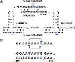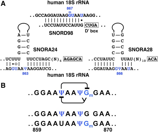 FIGURE 9. Interactions within a heavily modified region of human 18S rRNA. (A) Base-pairing between human 18S rRNA and guide RNAs SNORA24, SNORA28, and SNORD98 assigned for modification of positions 863, 866, and 867, respectively. (B) Predicted interference between Ψ863, Ψ866, and Gm867 (top row) and differentially modified fragments (second and third rows) experimentally detected by classical biochemical techniques (Maden and Wakeman 1988). Modified positions are colored in blue. |