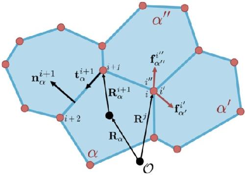 Fig. 2. Representation of disordered cell geometry. Cell \documentclass[12pt]{minimal} \usepackage{amsmath} \usepackage{wasysym} \usepackage{amsfonts} \usepackage{amssymb} \usepackage{amsbsy} \usepackage{upgreek} \usepackage{mathrsfs} \setlength{\oddsidemargin}{-69pt} \begin{document} }{}$\alpha$\end{document} has its centroid at \documentclass[12pt]{minimal} \usepackage{amsmath} \usepackage{wasysym} \usepackage{amsfonts} \usepackage{amssymb} \usepackage{amsbsy} \usepackage{upgreek} \usepackage{mathrsfs} \setlength{\oddsidemargin}{-69pt} \begin{document} }{}$\mathbf{R}_{\alpha}$\end{document} relative to a fixed origin, \documentclass[12pt]{minimal} \usepackage{amsmath} \usepackage{wasysym} \usepackage{amsfonts} \usepackage{amssymb} \usepackage{amsbsy} \usepackage{upgreek} \usepackage{mathrsfs} \setlength{\oddsidemargin}{-69pt} \begin{document} }{}$\mathscr{O}$\end{document}. The position of vertex \documentclass[12pt]{minimal} \usepackage{amsmath} \usepackage{wasysym} \usepackage{amsfonts} \usepackage{amssymb} \usepackage{amsbsy} \usepackage{upgreek} \usepackage{mathrsfs} \setlength{\oddsidemargin}{-69pt} \begin{document} }{}$i$\end{document} of cell \documentclass[12pt]{minimal} \usepackage{amsmath} \usepackage{wasysym} \usepackage{amsfonts} \usepackage{amssymb} \usepackage{amsbsy} \usepackage{upgreek} \usepackage{mathrsfs} \setlength{\oddsidemargin}{-69pt} \begin{document} }{}$\alpha$\end{document} is given equivalently via \documentclass[12pt]{minimal} \usepackage{amsmath} \usepackage{wasysym} \usepackage{amsfonts} \usepackage{amssymb} \usepackage{amsbsy} \usepackage{upgreek} \usepackage{mathrsfs} \setlength{\oddsidemargin}{-69pt} \begin{document} }{}$\mathbf{R}^{i}_{\alpha}$\end{document}, relative to the centroid, or \documentclass[12pt]{minimal} \usepackage{amsmath} \usepackage{wasysym} \usepackage{amsfonts} \usepackage{amssymb} \usepackage{amsbsy} \usepackage{upgreek} \usepackage{mathrsfs} \setlength{\oddsidemargin}{-69pt} \begin{document} }{}$\mathbf{R}^{j}$\end{document}, relative to \documentclass[12pt]{minimal} \usepackage{amsmath} \usepackage{wasysym} \usepackage{amsfonts} \usepackage{amssymb} \usepackage{amsbsy} \usepackage{upgreek} \usepackage{mathrsfs} \setlength{\oddsidemargin}{-69pt} \begin{document} }{}$\mathscr{O}$\end{document}. For a vertex (trijunction) at \documentclass[12pt]{minimal} \usepackage{amsmath} \usepackage{wasysym} \usepackage{amsfonts} \usepackage{amssymb} \usepackage{amsbsy} \usepackage{upgreek} \usepackage{mathrsfs} \setlength{\oddsidemargin}{-69pt} \begin{document} }{}$\mathbf{R}^{j}$\end{document}, there exist three vectors, \documentclass[12pt]{minimal} \usepackage{amsmath} \usepackage{wasysym} \usepackage{amsfonts} \usepackage{amssymb} \usepackage{amsbsy} \usepackage{upgreek} \usepackage{mathrsfs} \setlength{\oddsidemargin}{-69pt} \begin{document} }{}$\mathbf{R}^{i}_{\alpha}, \mathbf{R}^{i^{\prime}}_{\alpha^{\prime}}, \mathbf{R}^{i^{\prime\prime}}_{\alpha^{\prime\prime}}$\end{document} for cells, \documentclass[12pt]{minimal} \usepackage{amsmath} \usepackage{wasysym} \usepackage{amsfonts} \usepackage{amssymb} \usepackage{amsbsy} \usepackage{upgreek} \usepackage{mathrsfs} \setlength{\oddsidemargin}{-69pt} \begin{document} }{}$\alpha, \alpha^{\prime}, \alpha^{\prime\prime}$\end{document}, pointing to the same vertex. Cell properties, such as area and tangents along edges, are defined relative to the cell centroid. (Colour in online.) |