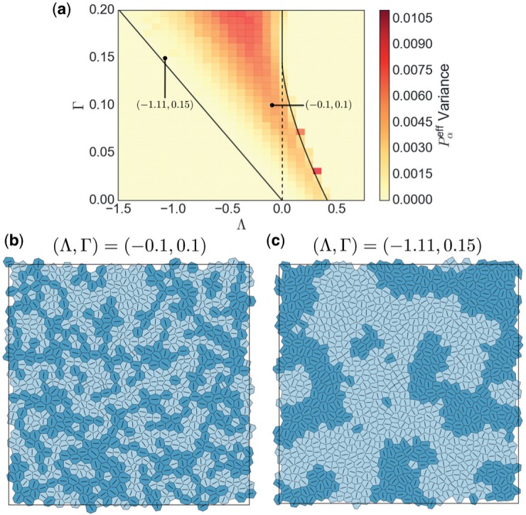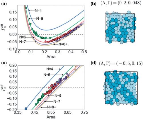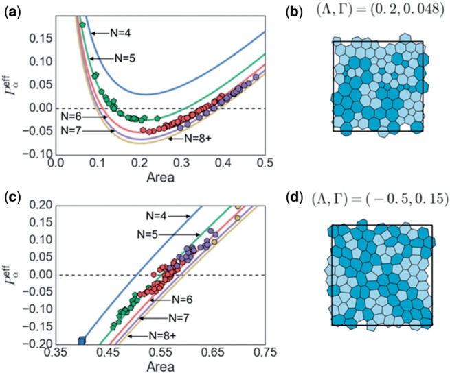 Fig. 9. Results of parameter fitting. (a) Heat map showing value of the likelihood function (4.1) across a uniform grid in valid parameter space. The simulated monolayers used were the same as those in Figs 6 and 7. For each monolayer, the mean areas per polygonal class were calculated and used to evaluate (4.1). The likelihood was maximized at \documentclass[12pt]{minimal} \usepackage{amsmath} \usepackage{wasysym} \usepackage{amsfonts} \usepackage{amssymb} \usepackage{amsbsy} \usepackage{upgreek} \usepackage{mathrsfs} \setlength{\oddsidemargin}{-69pt} \begin{document} }{}$(\Lambda, \Gamma)\approx (-0.26, 0.17)$\end{document}, marked by the circular symbol; a corresponding monolayer is shown in (b), with cells having \documentclass[12pt]{minimal} \usepackage{amsmath} \usepackage{wasysym} \usepackage{amsfonts} \usepackage{amssymb} \usepackage{amsbsy} \usepackage{upgreek} \usepackage{mathrsfs} \setlength{\oddsidemargin}{-69pt} \begin{document} }{}$P_\alpha^{\text{eff}}>0$\end{document} (\documentclass[12pt]{minimal} \usepackage{amsmath} \usepackage{wasysym} \usepackage{amsfonts} \usepackage{amssymb} \usepackage{amsbsy} \usepackage{upgreek} \usepackage{mathrsfs} \setlength{\oddsidemargin}{-69pt} \begin{document} }{}$<0$\end{document}) shaded dark (light). (c, d) Distributions of area and circularity across polygonal classes for simulations with \documentclass[12pt]{minimal} \usepackage{amsmath} \usepackage{wasysym} \usepackage{amsfonts} \usepackage{amssymb} \usepackage{amsbsy} \usepackage{upgreek} \usepackage{mathrsfs} \setlength{\oddsidemargin}{-69pt} \begin{document} }{}$(\Lambda^\dagger,\Gamma^\dagger)=(-0.259,0.172)$\end{document} for increasing values of \documentclass[12pt]{minimal} \usepackage{amsmath} \usepackage{wasysym} \usepackage{amsfonts} \usepackage{amssymb} \usepackage{amsbsy} \usepackage{upgreek} \usepackage{mathrsfs} \setlength{\oddsidemargin}{-69pt} \begin{document} }{}$P_{\mathrm{ext}}$\end{document}. (Colour in online.) |