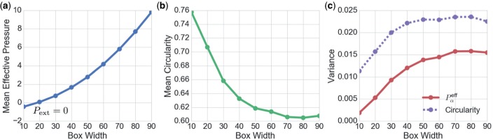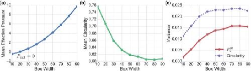 Fig. 8. Visualizing the effect of peripheral stress on network packing geometry. 800 cells were simulated in boxes of width , lower mean circularity and greater variability. (Colour in online.) |