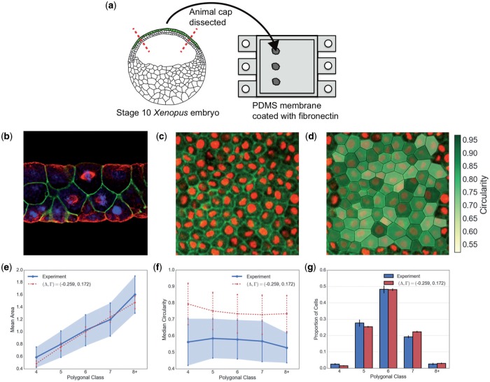 Fig. 1. Experimental setup and data analysis. (a) Animal cap tissue was dissected from stage-10 Xenopus laevis embryos and cultured on PDMS membrane. (b) Side-view confocal image of the animal cap (top:apical; bottom:basal), stained for microtubules (red), beta-catenin (green) and DNA (blue). A mitotic spindle is visible in the centremost apical cell. The animal cap is a multi-layered epithelial tissue; we analyse just the outer, apical, cell layer. (c) The apical cell layer of the animal cap tissue is imaged live using confocal microscopy (green, GFP-\documentclass[12pt]{minimal} \usepackage{amsmath} \usepackage{wasysym} \usepackage{amsfonts} \usepackage{amssymb} \usepackage{amsbsy} \usepackage{upgreek} \usepackage{mathrsfs} \setlength{\oddsidemargin}{-69pt} \begin{document} }{}$\alpha$\end{document}-tubulin; red, cherry-histone2B). (d) The cell edges are manually traced and cell shapes are derived computationally, being polygonized using the positions of cell junctions. (e) Mean normalized area as a function of polygonal class showing mean and one standard deviation, from experiments (solid and shaded) and simulation (dashed) with parameters \documentclass[12pt]{minimal} \usepackage{amsmath} \usepackage{wasysym} \usepackage{amsfonts} \usepackage{amssymb} \usepackage{amsbsy} \usepackage{upgreek} \usepackage{mathrsfs} \setlength{\oddsidemargin}{-69pt} \begin{document} }{}$\Lambda$\end{document}, \documentclass[12pt]{minimal} \usepackage{amsmath} \usepackage{wasysym} \usepackage{amsfonts} \usepackage{amssymb} \usepackage{amsbsy} \usepackage{upgreek} \usepackage{mathrsfs} \setlength{\oddsidemargin}{-69pt} \begin{document} }{}$\Gamma$\end{document} as shown with \documentclass[12pt]{minimal} \usepackage{amsmath} \usepackage{wasysym} \usepackage{amsfonts} \usepackage{amssymb} \usepackage{amsbsy} \usepackage{upgreek} \usepackage{mathrsfs} \setlength{\oddsidemargin}{-69pt} \begin{document} }{}$P_{\mathrm{ext}}=0$\end{document}. Cell areas were normalized relative to the mean of each experiment. (f) Circularity as a function of polygonal class showing mean and one standard deviation, from experiments (solid and shaded) and simulation (dashed) using the same parameters as in (e). (g) Proportions of total cells in each polygonal class in experiments (left bar) and simulations (right bar). Error bars represent \documentclass[12pt]{minimal} \usepackage{amsmath} \usepackage{wasysym} \usepackage{amsfonts} \usepackage{amssymb} \usepackage{amsbsy} \usepackage{upgreek} \usepackage{mathrsfs} \setlength{\oddsidemargin}{-69pt} \begin{document} }{}$95\%$\end{document} confidence intervals calculated from bootstrapping the data. (Colour in online.) |