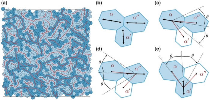 Fig. D1. (a) An example of force chains in a monolayer, with 800 cells and is excluded because is fails (D.1a) (c), despite satisfying (D.1b) (e). (Colour in online.) |