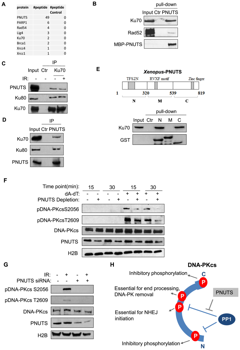 DNA-dependent protein kinase catalytic subunit (DNA-PKcs) plays a key role in mediating non-homologous end joining (NHEJ), a major repair pathway for DNA double-strand breaks (DSBs). The activation, function and dynamics of DNA-PKcs is regulated largely by its reversible phosphorylation at numerous residues, many of which are targeted by DNA-PKcs itself. Interestingly, these DNA-PKcs phosphorylation sites function in a distinct, and sometimes opposing manner, suggesting that they are differentially regulated via complex actions of both kinases and phosphatases. In this study we identified several phosphatase subunits as potential DSB-associated proteins. In particular, protein phosphatase 1 (PP1) is recruited to a DSB-mimicking substrate in Xenopus egg extracts and sites of laser microirradiation in human cells. Depletion of PP1 impairs NHEJ in both Xenopus egg extracts and human cells. PP1 binds multiple motifs of DNA-PKcs, regulates DNA-PKcs phosphorylation, and is required for DNA-PKcs activation after DNA damage. Interestingly, phosphatase 1 nuclear targeting subunit (PNUTS), an inhibitory regulator of PP1, is also recruited to DNA damage sites to promote NHEJ. PNUTS associates with the DNA-PK complex and is required for DNA-PKcs phosphorylation at Ser-2056 and Thr-2609. Thus, PNUTS and PP1 together fine-tune the dynamic phosphorylation of DNA-PKcs after DNA damage to mediate NHEJ.