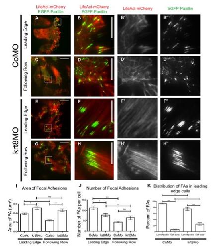 Fig. 3. Focal adhesion dynamics and actin cytoskeleton are altered in krt8 morphant explants. (A,C,E,G) Representative TIRF images of mesendoderm explants expressing LifeAct- mCherry (red) and EGFP-paxillin (green). (B-Bâ²â²,D- Dâ²â²,F-Fâ²â²,H-Hâ²â²) Magnified views of the boxes in A, C, E and G, corresponding to merged (B,D,F,H) and separate LifeAct-mCherry (Bâ²,Dâ²,Fâ²,Hâ²) and EGFP- paxillin (Bâ²â²,Dâ²â²,Fâ²â²,Hâ²â²) channels. (I-K) Quantifications of FA area (I), FAs per cell (J) and distribution of FAs within cells (K), calculated from the first frames of nine movies for each condition (Movies 3-6) (nine individual explants per condition were imaged across three separate experiments; data are mean±s.e.m. *P<0.05; **P<0.01; ***P<0.001; ns, not significant). Scale bars: 25 μm in A, C, E and G; 10 μm in B, D, F and H. |