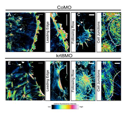 Fig. 4. Actin stress fibers predominate in mesendoderm explants from keratin morphant embryos. (A-H) Confocal projections of phalloidin-stained control (A-D) and krt8 morphant (E-H) explants on FN. Pseudocolors correspond to fluorescence intensity heat map. Collapsed Z-stack images of representative explants at low magnification (A,E), leading row lamellipodia (B,F), following row protrusions (C,G) and cell-cell junctions (D,H). Arrowheads in A and C indicate specialized filopodia; arrows indicate small protrusions. Dotted lines in D and H indicate borders between two cells (six individual explants per condition were imaged across two separate experiments). Scale bars: 25 μm in A, B, E and F; 10 μm in C, D, G and H. |