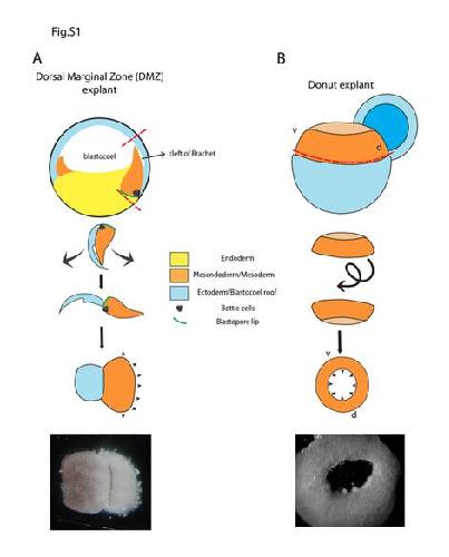 Fig. S1: Preparation of ex vivo explants from live embryos. (A) Cartoon of a bisected stage 11 embryo and steps involved in preparing a Dorsal Marginal Zone (DMZ) explant. Red dashed lines indicate the region of excision. After excision, endoderm tissue adjoining the mesendoderm/mesoderm tissue is removed. The explant is then jackknifed open so that the region normally adjacent to the bcr is placed in contact with a FN coated coverslip. (B) Cartoon of a late stage 11 embryo with blastocoel roof removed to reveal mesendoderm cup. Red dashed line indicates the region of excision. In order to maintain proper orientation with respect to bcr and assembled FN, the donut explant is inverted and placed in contact with a FN coated coverslip. ‘d’ and ‘v’ indicate the dorsal and ventral sides of the donut respectively. |