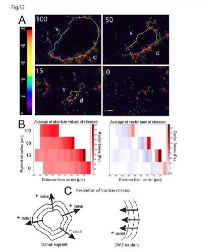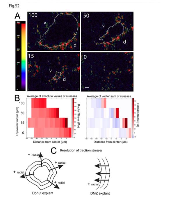 Fig. S2: Traction stresses concentrated at the leading of a donut explant gradually increase as the donut closes. (A) Representative traction stress maps of a control donut explant at four stages of closure. Arrows in the heat map indicate directions of force and are scaled and pseudocolored to indicate force magnitude. White lines on the maps correspond to the leading edge of the donut and show the progression of donut closure over time. Numbers on each panel indicate the equivalent radii of open area in center of the donut. Equivalent radii were derived from the area of the open center (Area=Πr2). ‘d’ and ‘v’ indicate the dorsal and ventral sides of the donut respectively. Scale bar =25μm. (B) Kymographs of average traction stress generated by mesendoderm cells during donut closure. The donut explant Development • Supplementary information Development 144: doi:10.1242/dev.155200: Supplementary information was divided into 10μm wide concentric contours from the leading edge and mean traction stresses within each 10μm region were calculated. The X-axis of the kymograph represents the distance from the donut center and the Y-axis represents equivalent radii of the donut explant. (C) Cartoon showing resolution of traction stresses in a donut and DMZ explant. For a donut explant, traction stresses perpendicular to the leading edge and opposite to the direction of migration were considered positive radial traction stresses. For a DMZ explant, traction stresses opposite to the direction of migration (left to right) were considered positive radial traction stresses. |