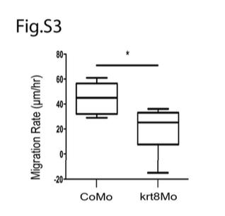 Fig. S3: Migration rates of mesendoderm tissue from control and krt8 morphant embryos. Positive values denote forward migration and negative values indicate leading edge retractions during the course of migration. Average rate of forward migration for Control Mo: 44.67± 5.077μm/hr and Xck Mo: 19.73± 7.561 μm/hr, * p<0.05. Velocities were calculated from two time points from three separate control and krt8 morphant explants. |