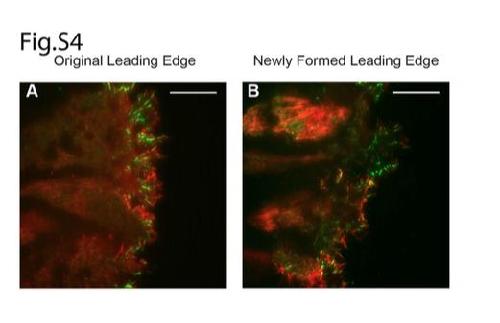 Fig. S4: Following row cells can reorganize to form leading edge cells. (A) Mesendoderm explant expressing EGFP-paxillin (Green) and LifeAct-mCherry (Red) plated on FN and imaged after one hour using TIRF microscopy. The leading edge of the explant was excised with an eyebrow knife and the explant was allowed to heal for one hour. (B) Following healing, the explant was further imaged (Representative of 4 individual explants across 2 separate experiments). Scale bar=25um (A and B). |