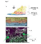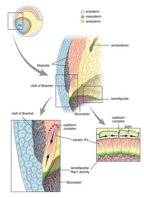 Fig. 7. Summary of mesendoderm morphogenesis in a mid- gastrula stage Xenopus embryo. Center: Cut-away profile view of the boxed region from a bisected embryo (upper left; bc, blastocoel) showing the anterior progression of the mesendoderm and its spatial relationship to the BCR, fibrillar FN matrix, and the trailing mesoderm and endoderm. Lower left: Higher magnification view highlighting the leading edge mesendoderm cell with large forward protrusion ‘pulling’ on the overlying BCR. The FN matrix is remodeled as the leading edge passes over it. The rear of the leading edge cell is attached to follower row cells via a cadherin- containing adhesion complex that includes a basket-like arrangement of keratin filaments. Arrows indicate the balancing of forward traction stresses with intercellular stresses at the rear. Follower cells extend long specialized filopodia (cytonemes) into the cleft of Brachet, which is widened at this location by the failure of following row cells to adhere to the BCR. Lower right: En face view of mesendoderm highlighting the relationship of leading edge cells with their broad lamellipodia in contact with the BCR, to circumferentially arranged upper row cells with their stress fiber- like organization of actin filaments (see also Fig. S6). Upper row cells likely contribute to closure of the mesendoderm mantle by applying tangential stresses (black arrows) perpendicular to the radial stresses of the underlying leading row cells. Rac1 activity gradient (green shading) in leading edge cells is highest in the protrusions. |