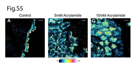 Fig. S5: Acrylamide treatment of mesendoderm explants leads to rearrangement of actin cytoskeleton. (A-C) Confocal projections of fixed and phalloidin stained mesendoderm explants on FN substrates after treatment with acrylamide at the concentrations indicated (B and C). Pseudocolors correspond to the fluorescence intensity heat map (Representative of 9 individual explants per condition imaged across 3 separate experiments). Scale bar=25um (A-C). |