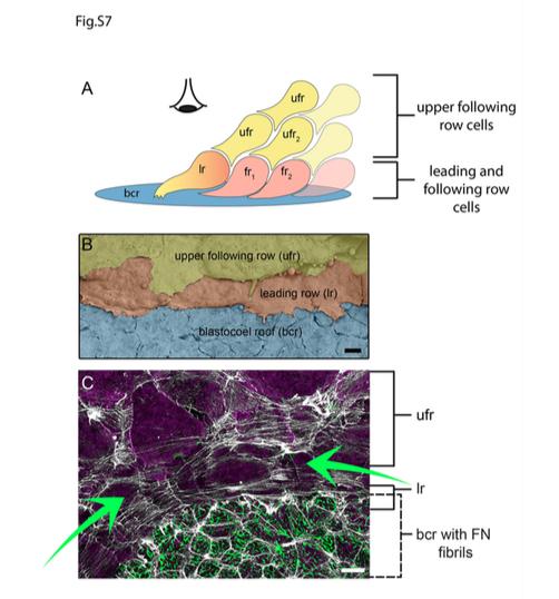 Fig. S7: (A) Cartoon of the organization of mesendoderm cell rows during gastrulation. Perspective of panels B and C are indicated by the eye. The leading row (lr) and following row (fr) cells are in contact with the bcr and fibronectin matrix whereas the upper following rows (ufr) of cells are only in contact with one another. Cells are numbered with respect to their position away from the free edge. (e.g. fr1, ufr2). (B) Scanning electron micrograph of mesendoderm and blastocoel roof tissue excised from a fixed stage 12 embryo. Upper following row cells (yellow) extend protrusions onto the leading row (orange) cells beneath. Scale bar =10μm. (C) Projection of confocal z-sections of stage 12 mesendoderm and blastocoel roof tissue immunostained with antibodies to FN (green) and beta-catenin (magenta). Actin (white) was visualized using phalloidin. Green arrows indicate circumferential forces. ufr, upper following row; lr, leading row; bcr, blastocoel roof. Scale bar=20 μm |