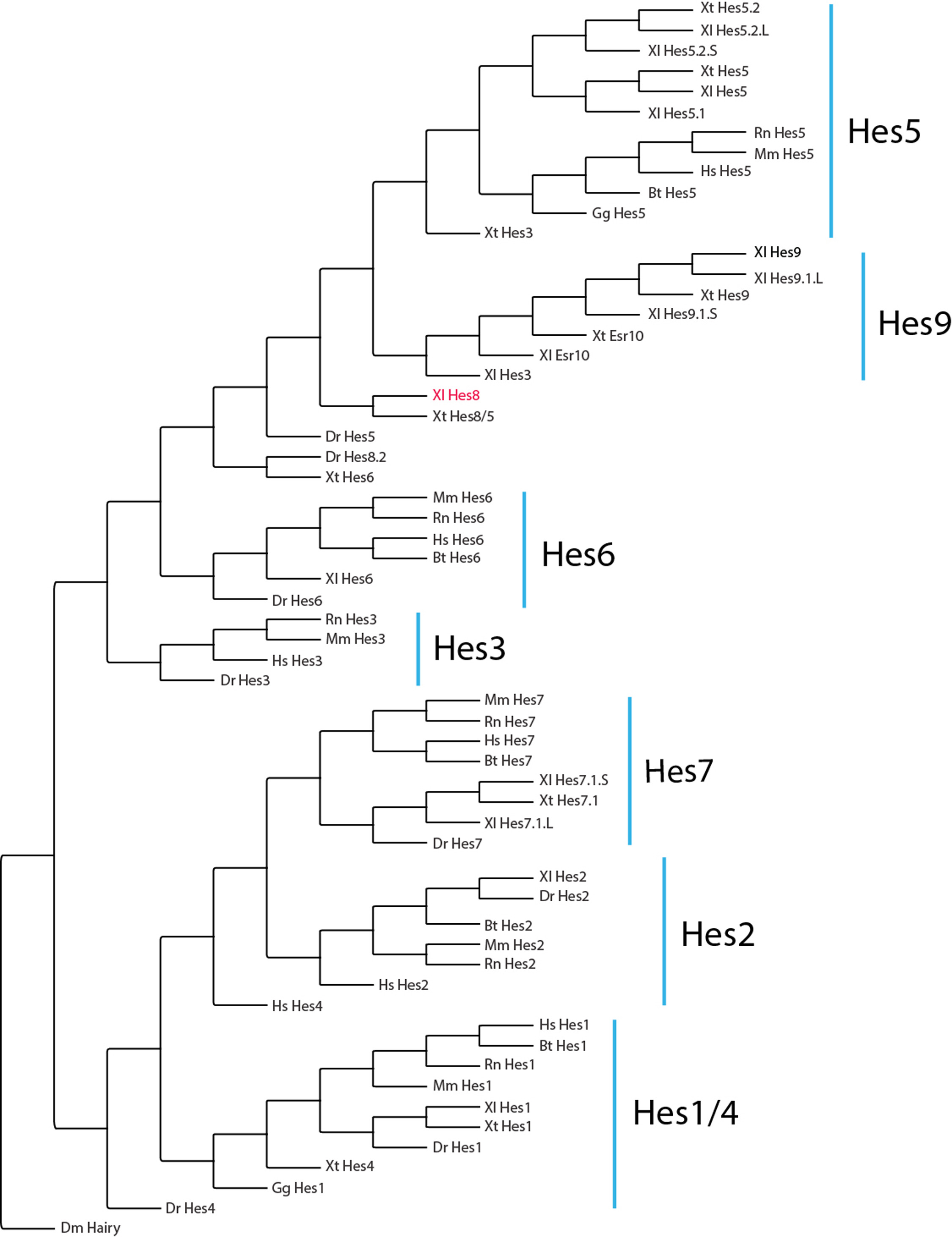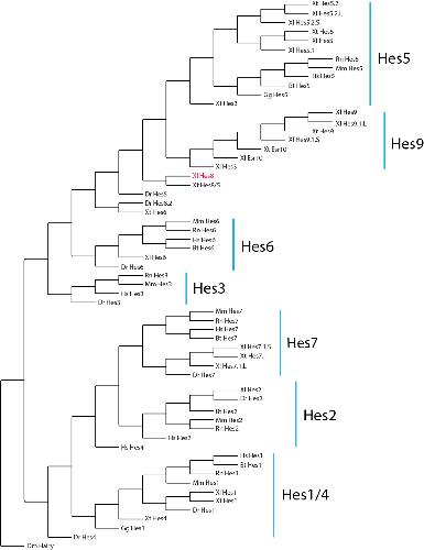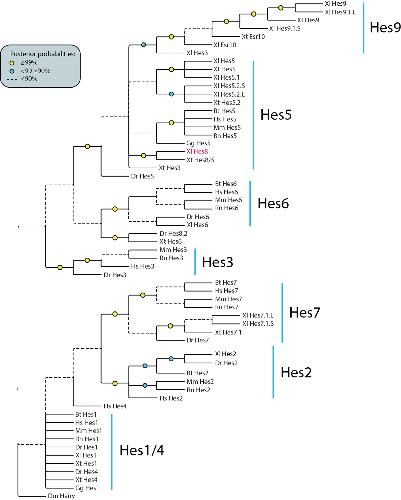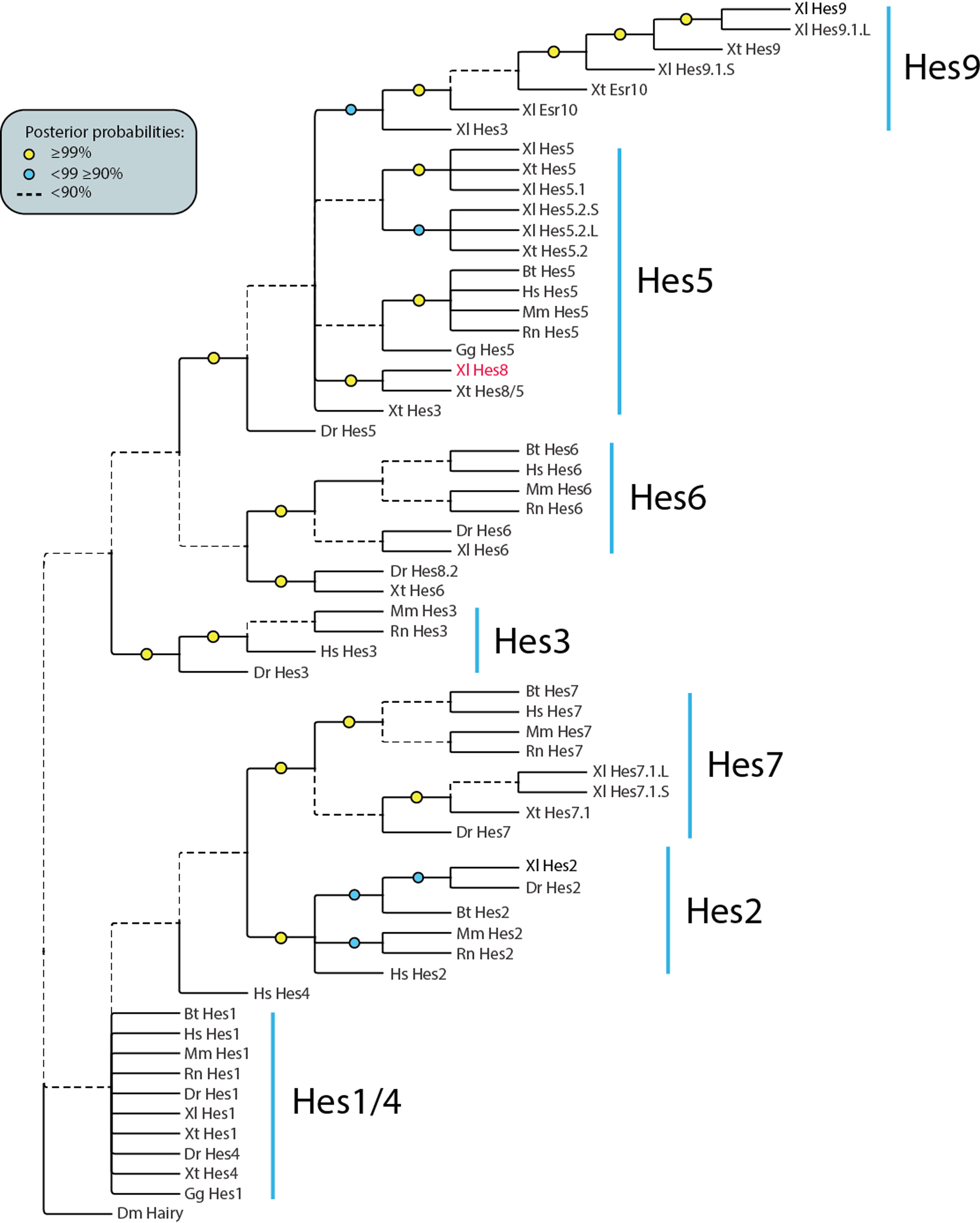 Fig. 1. Phylogeny of Hes proteins. Bayesian inference analysis of vertebrate Hes proteins based on a concatenated alignment of 76 amino acid residues encompassing the conserved bHLH and Orange domains (Fig. S1). X. laevis Hes8 shown in red. Nodal support shown as posterior probabilities where ≥ 90 is shown as solid lines and support below 90% shown as dashed lines. Accession numbers can be found in Table S1. Abbreviations: Dr: Danio rerio, Xl: Xenopus laevis, Xt: Xenopus tropicalis, Gg: Gallus gallus, Bt: Bos taurus, Hs: Homo sapiens, Rn: Rattus norvegicus, Mm: Mus musculus, Dm: Drosophila melanogaster (outgroup). |
