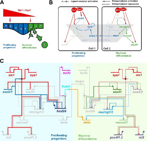 Fig. 8. Model for Six1 and Eya1 functions in placodal neurogenesis. A: While high doses of Six1 and Eya1 promote expansion of proliferating progenitors, declining levels of Six1 and Eya1 when cells migrate away from placodes promote neuronal differentiation. B: Interaction of Six1 and Eya1 with genes and proteins involved in the Notch mediated lateral inhibition pathway (hes8, neurog1/2, delta1, Notch; grey area). Thick red arrows indicate that target genes are activated only by high levels of Six1 and Eya1, while thin red arrows indicate that target genes can be activated by low levels of Six1 and Eya1. In progenitors, high levels of Six1 and Eya1 transcriptionally activate sox2/3 and hes8 - which may be activated even in the absence of Notch signaling - thereby repressing the transcription of neurog1/2 and neuronal differentiation. In differentiating neurons, low levels of Six1 and Eya1, which are not sufficient to activate sox2/3 and hes8, transcriptionally activate neurog1/2 and pou4f1.2, thereby promoting neuronal differentiation. While Sox2/3 alone inhibits neuronal differentiation upstream (hatched line) and downstream (not shown) of neurog1/2 it poises neurog1/2 for activation in conjunction with Six1 and Eya1. In addition to the interactions depicted, Sox21 has been reported to either repress (Sandberg et al., 2005) or promote (Whittington et al., 2015) neuronal differentiation genes; due to these conflicting reports, we do not show these interactions here. C: Detailed gene regulatory network designed using BioTapestry (Longabaugh et al., 2005, 2009) for regulation of neurogenesis downstream of Six1 and Eya1 based on this and previous studies. References supporting the interactions shown are given in Table S2. Arrows indicate direct (solid line) and indirect (dotted line) activation; barred lines show direct (solid line) and indirect (dotted line) repression. Thin lines indicate a low level of expression, whereas thick lines show high levels of expression. Greyed out genes represent those inactive in current cell (e.g. neuronal differentiation genes in progenitors). Low level activation of Sox2/3 in differentiating neurons is shown as faded violet. See text for details. |