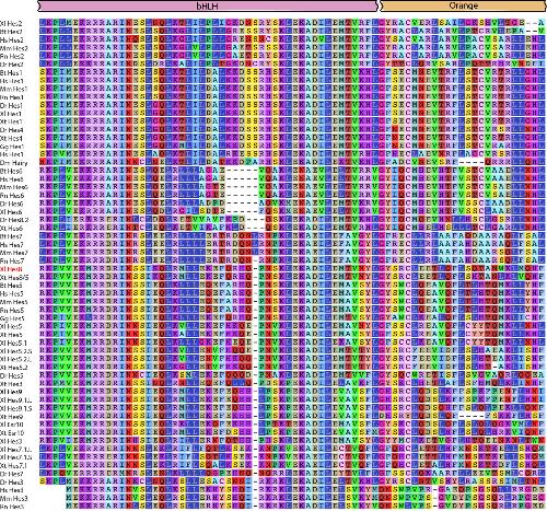 Fig. S1. Alignment of vertebrate Hes proteins. bHLH and Orange (indicated by pink and orange bars at the top of alignment) domains were concatenated resulting in an alignment of 76 amino acids across 61 sequences. X. laevis Hes8 shown in red. The Drosophila protein Hairy was specified as outgroup in subsequent phylogenetic analysis. Accession numbers can be found in Table S1. |