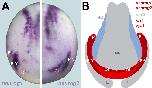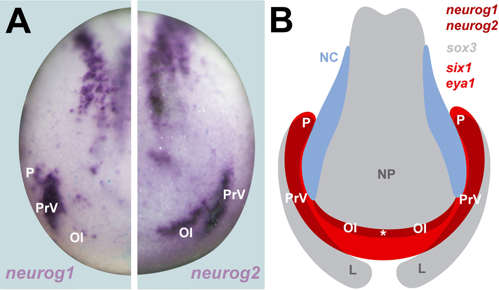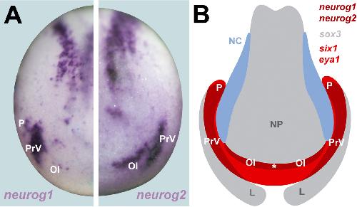 Fig. S6. Neurog1and neurog2 expression in regions of six1/eya1 and sox3 coexpression. A:Placodal expression domains of neurog1 and neurog2 in Xenopus laevis. B: Since Six1/Eya1 and Sox3 synergize in activation of the Neurogenins, placodal expression of neurog1 and neurog2 is activated where Six1/Eya1 and Sox3 expression domains overlap (see (Schlosser and Ahrens, 2004). This interpretation is in conflict with a previous study suggesting that the pax3 expressing profundal placode is located in the sox3 free area between neural plate and lateral sox3 domains (Schlosser and Ahrens, 2004). However the extent of sox3 expression in the lateral domain may have been underestimated in our previous study due to relatively weak staining after double in situ hybridization. It is currently not clear why hes8 and other Hes genes are expressed in a similar pattern to neurog1 since the present study did not find evidence of Sox3-Six1/Eya1 synergy; possibly Six1 and Eya1 synergize with other factors than Sox3 which are expressed in a Sox3-like pattern in activating these Hes genes. Asterisk marks area of prospective adenohypophyseal placode, where neurog2 is transiently expressed but quickly downregulated (Schlosser and Ahrens, 2004). Abbreviations: L: lateral domain of Sox3 expression; NC; neural crest; NP: neural plate; Ol: olfactory placode; P: posterior placodal area; PrV: profundal/trigeminal placode. |