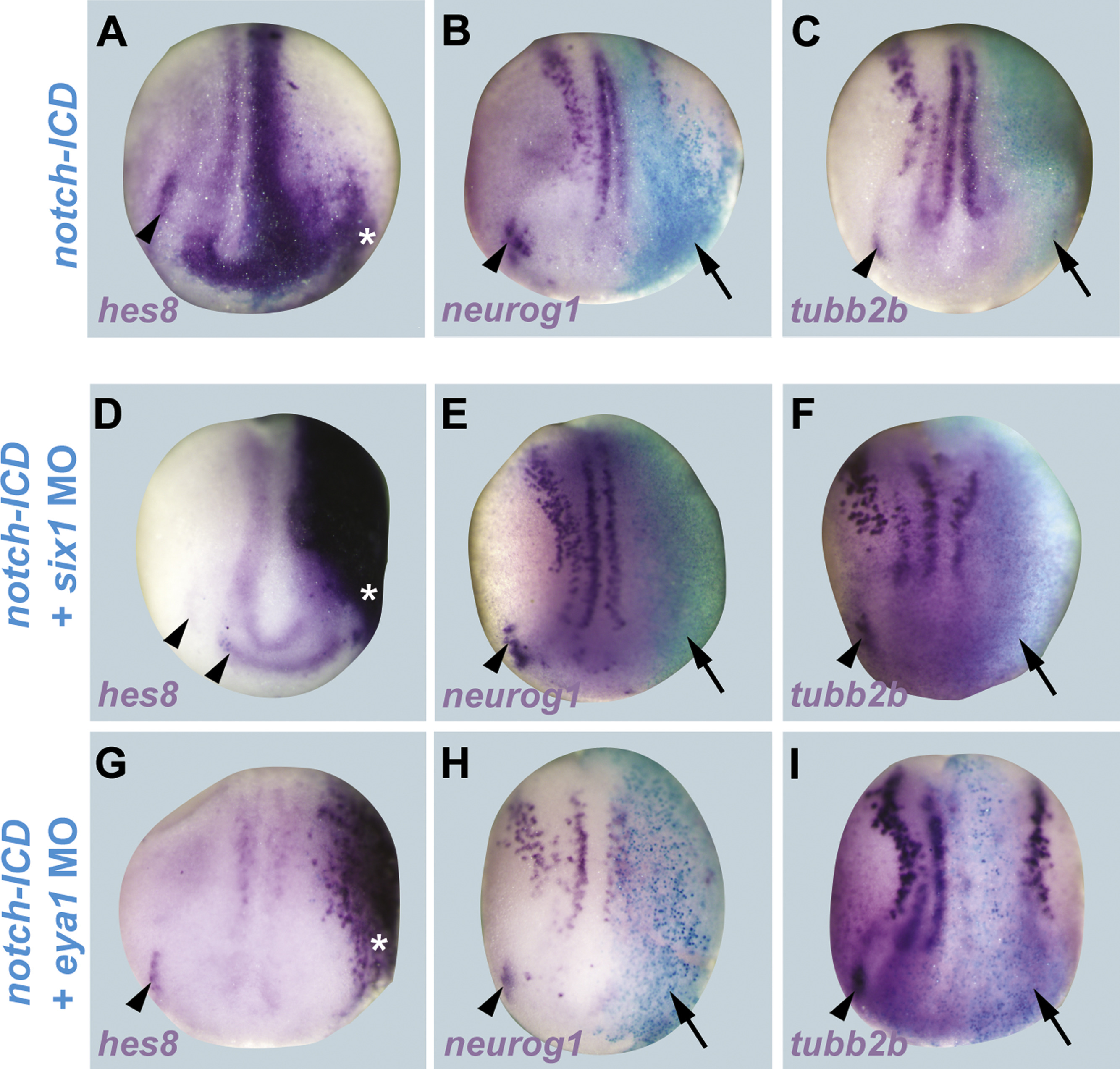 Fig. 2. Hes8is activated by Notch signaling. Expression of hes8, neurog1 and tubb2b in neural plate stage Xenopus embryos after injection of notch-ICD either alone (A-C) or together with six1 MO (D-F) or eya1 MO (G-I). Control side is shown on the left and injected side on the right (as indicated by blue lacZ staining). In each case, injection of notch-ICD leads to upregulation of hes8 (A, D, G) and repression of neurog1 (B, E, H) and tubb2b (C, F, I). Arrowheads indicate expression domains in developing placodes. Arrows indicate reductions in placodal expression while asterisks indicate increased expression in placodes or adjacent non-neural ectoderm. |