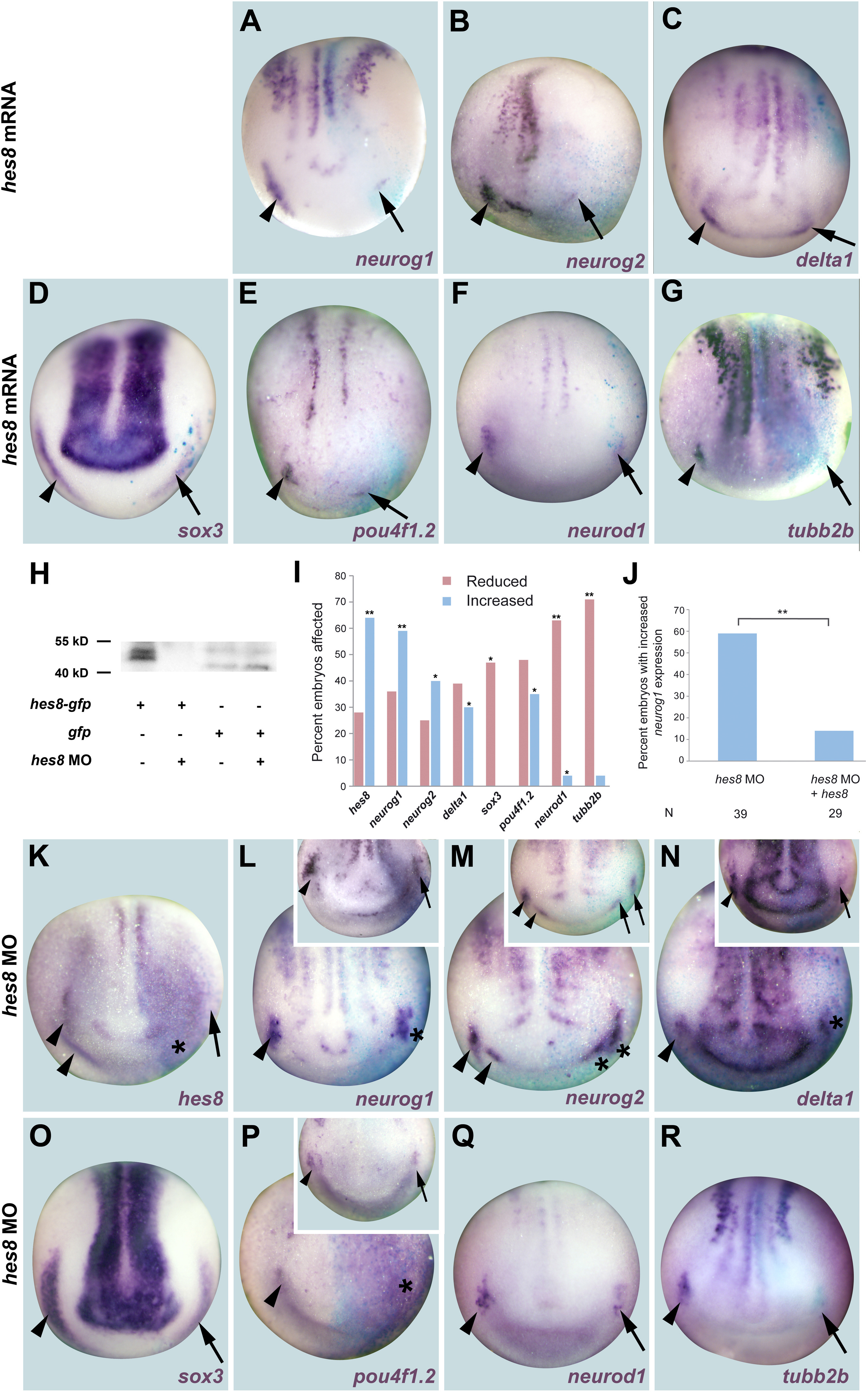 Fig. 3. Hes8represses neuronal determination genes. A-G, K-R: Expression of various neurogenesis genes in neural plate stage Xenopus embryos after injection of hes8 mRNA (A-G) or hes8 MO (K-R). Control side is shown on the left and injected side on the right (as indicated by blue LacZ staining). Arrowheads indicate expression domains in developing placodes. Arrows indicate reductions in placodal expression while asterisks indicate increased expression in placodes or adjacent non-neural ectoderm. Hes8 overexpression leads to repression of all markers analyzed, while Hes8 knockdown promotes expansion of hes8, neurog1, neurog2, delta1 and pou4f1.2 but reduction of sox3, neurod1 and tubb2b expression. H: Western blot after in vitro transcription and translation of hes8 in the presence or absence of hes8 MO demonstrates efficacy of hes8 MO. I: Frequency of embryos with reductions of neurogenesis genes in PPR/placodes (red) or increases of neurogenesis genes in PPR/placodes or adjacent non-neural ectoderm (blue) after hes8 MO injections (see Table 3 for numbers). Significant changes to control MO are indicated (Fisher's exact test; *: p<0.05, **: p<0.001). J: Increased placodal neurog1 expression after injection of hes8 MO is rescued by coinjection of hes8 mRNA. |