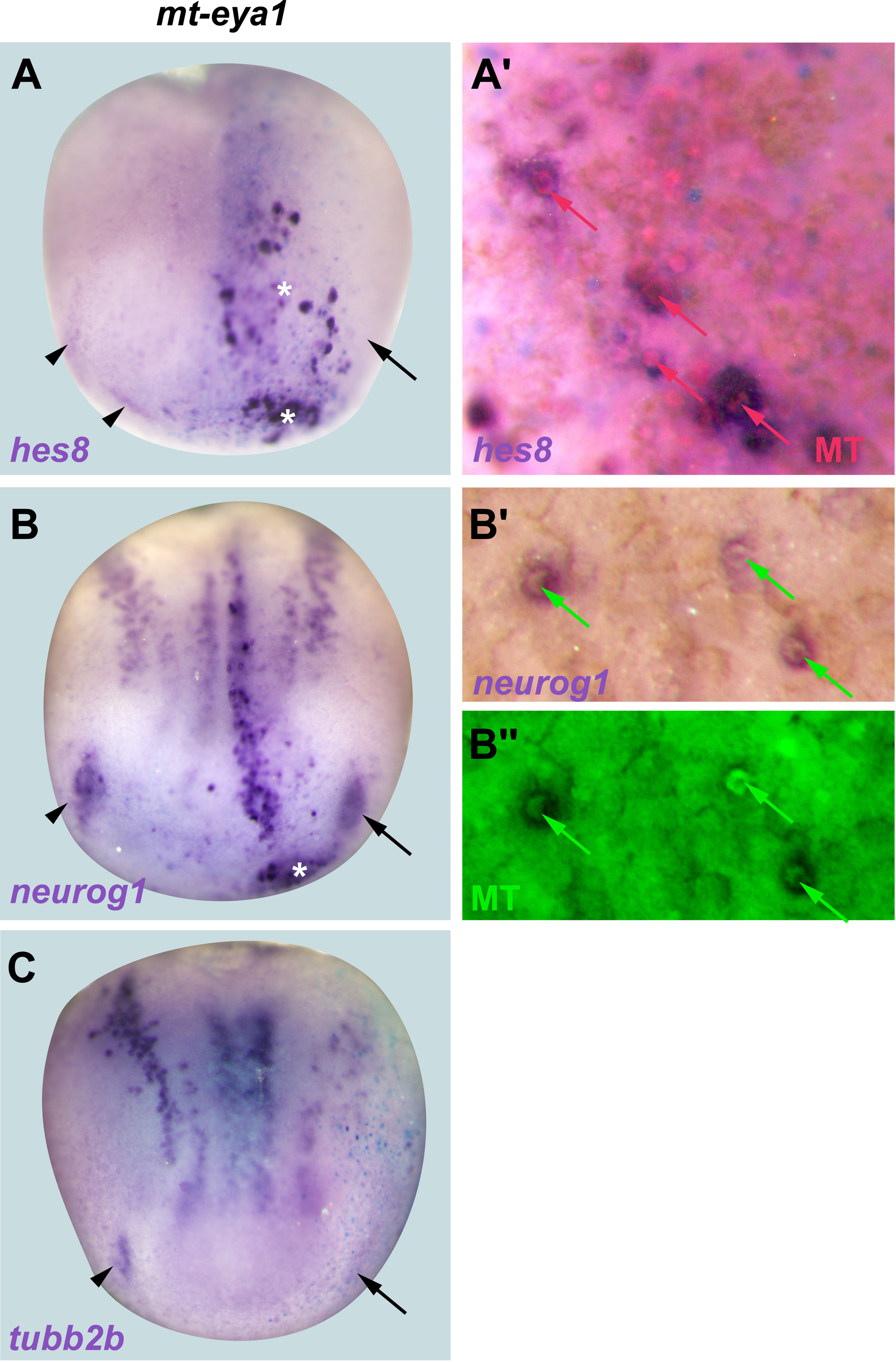 Fig. 5. Cell autonomous effects of Six1 and Eya1. A-C: Expression of hes8, neurog1 and tubb2b in neural plate stage Xenopus embryos after injection of a myc-tagged (mt) eya1 plasmid. Control side is shown on the left and injected side on the right (as indicated by blue LacZ staining). Arrowheads indicate expression domains in developing placodes. Arrows indicate reductions in placodal expression while asterisks indicate increased expression in placodes or adjacent non-neural ectoderm. Both hes8 and neurog1 but not tubb2b show ectopic expression. Aâ², Bâ², Bâ²â²: Ectopic expression of hes8 and neurog1 in non-neural ectoderm of embryos injected with mt-eya1 at higher magnification together with immunostaining for myc (MT). Colored arrows indicate hes8 and neurog1 expression in MT immunopositive cells. |