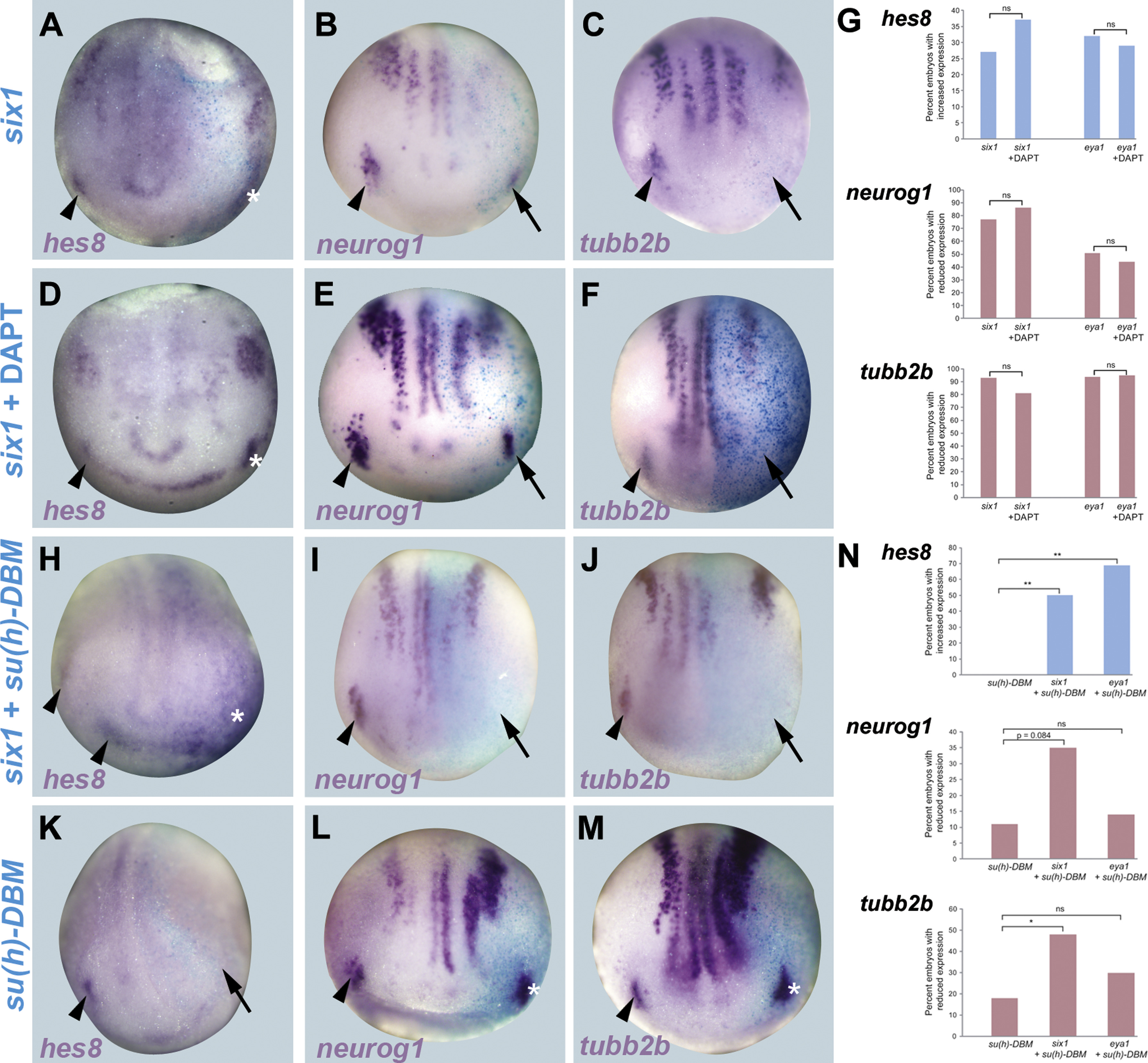 Fig. 7. Six1 activates hes8 and represses neuronal differentiation independent of Notch. A-F, H-M: Expression of hes8, neurog1 and tubb2b in neural plate stage Xenopus embryos after injection of six1 mRNA (A-C), six1 mRNA followed by DAPT treatment (D-F), six1 plus su(h)-DBM mRNA (H-J) or su(h)-DBM mRNA (K-M) alone. Control side is shown on the left and injected side on the right (as indicated by blue lacZ staining). Arrowheads indicate expression domains in developing placodes. Arrows indicate reductions in placodal expression while asterisks indicate increased expression in placodes or adjacent non-neural ectoderm. Overexpression of Six1 upregulates hes8 and represses neurog1 and tubb2b even when Notch signaling is blocked by DAPT or su(h)-DBM. G: Frequency of increased hes8 expression in PPR/placodes or adjacent non-neural ectoderm (blue) or reduced neurog1 or tubb2b expression in PPR/placodes in embryos injected with six1 and eya1 is not significantly altered by DAPT treatment (for numbers see Table 1). N: Frequency of increased hes8 expression in embryos injected with su(h)-DBM is significantly increased by coinjection of six1 and eya1 while frequency of reduced neurog1 or tubb2b expression in embryos injected with su(h)-DBM is reduced after coinjection of six1 but not eya1 (for numbers see Table 1) |