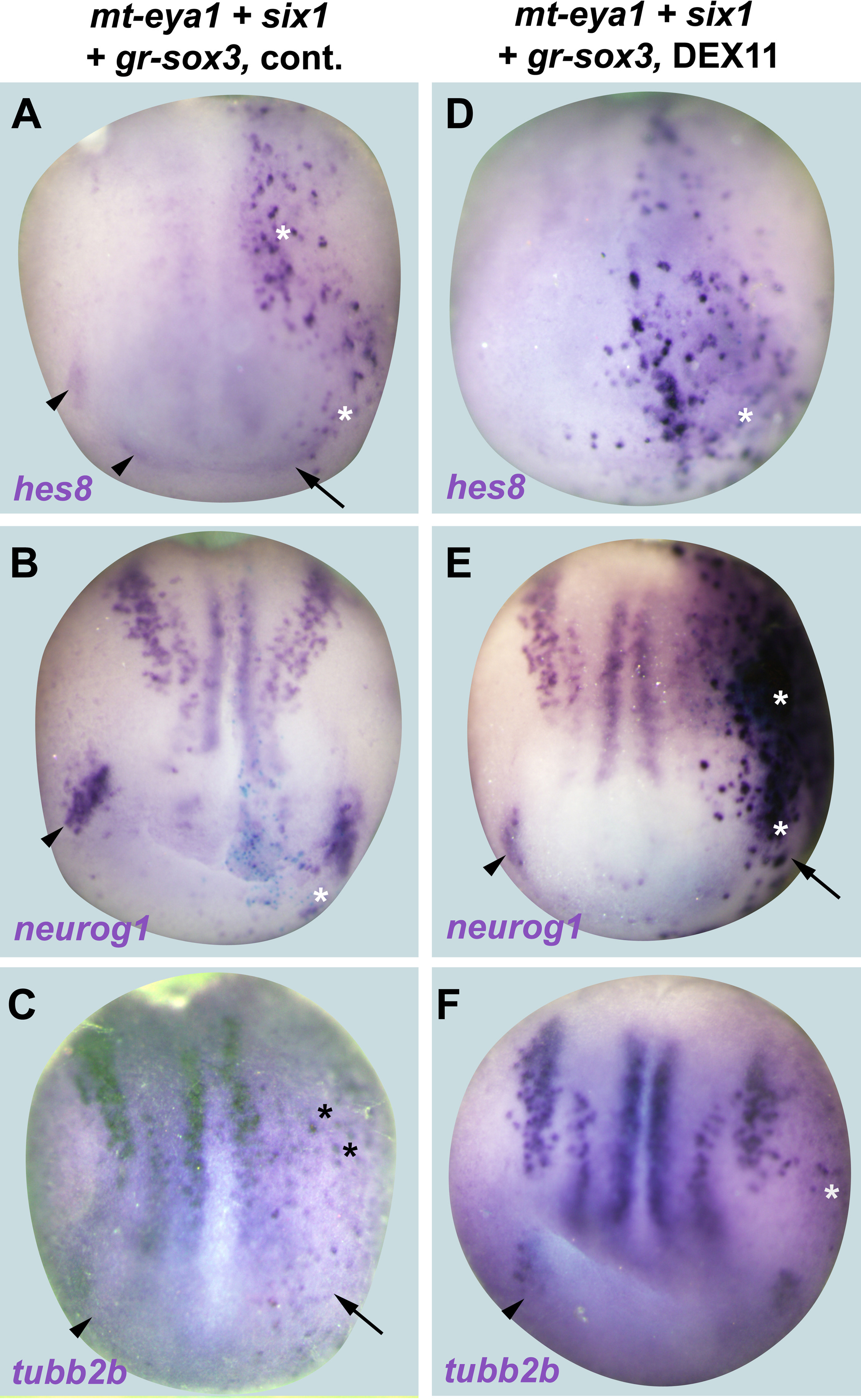 Fig. S4. Synergy of Six1 and Eya1 with Sox3. A-I: Expression of hes8, neurog1 and tubb2b in neural plate stage Xenopus embryos after injection of myc-tagged (mt) eya1 plasmids in conjunction with six1 plasmids and gr-sox3 mRNA without (A-C; cont.: control) or with DEX treatment at stage 11 (D-F). Control side is shown on the left and injected side on the right (as indicated by blue LacZ staining). Arrowheads indicate expression domains in developing placodes. Arrows indicate reductions in placodal expression while asterisks indicate increased expression in placodes or adjacent non-neural ectoderm. Both hes8 and neurog1 show ectopic expression in both cases, with more intense upregulation of neurog1 in the presence of sox3. Ectopic tubb2b expression is observed after coinjection of eya1 and six1 but is not increased in the presence of Sox3. |