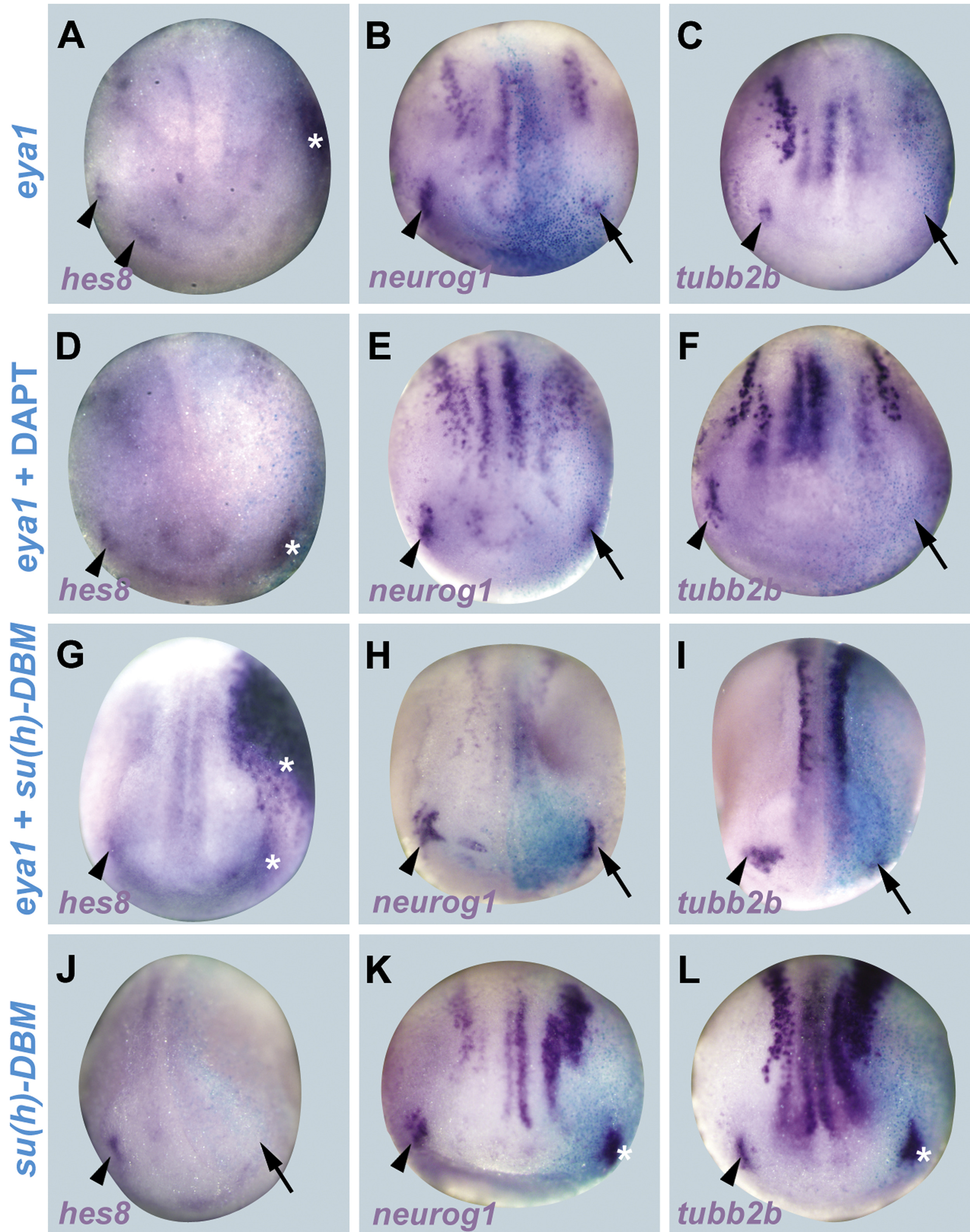 Fig. S5. Eya1 activates hes8 and represses neuronal differentiation independent of Notch. A-L: Expression of hes8, neurog1 and tubb2b in neural plate stage Xenopus embryos after injection of eya1 mRNA (A-C), eya1 mRNA followed by DAPT treatment (D-F), eya1 plus su(h)-DBM mRNA (H-J) or su(h)-DBM mRNA (K-M) alone. Control side is shown on the left and injected side on the right (as indicated by blue LacZ staining). Arrowheads indicate expression domains in developing placodes. Arrows indicate reductions in placodal expression while asterisks indicate increased expression in placodes or adjacent non-neural ectoderm. Overexpression of Eya1 upregulates hes8 even when Notch signaling is blocked by DAPT or su(h)-DBM while neurog1 and tubb2b are occasionally repressed (but not significantly more frequent than after injection of su(h)-DBM). |