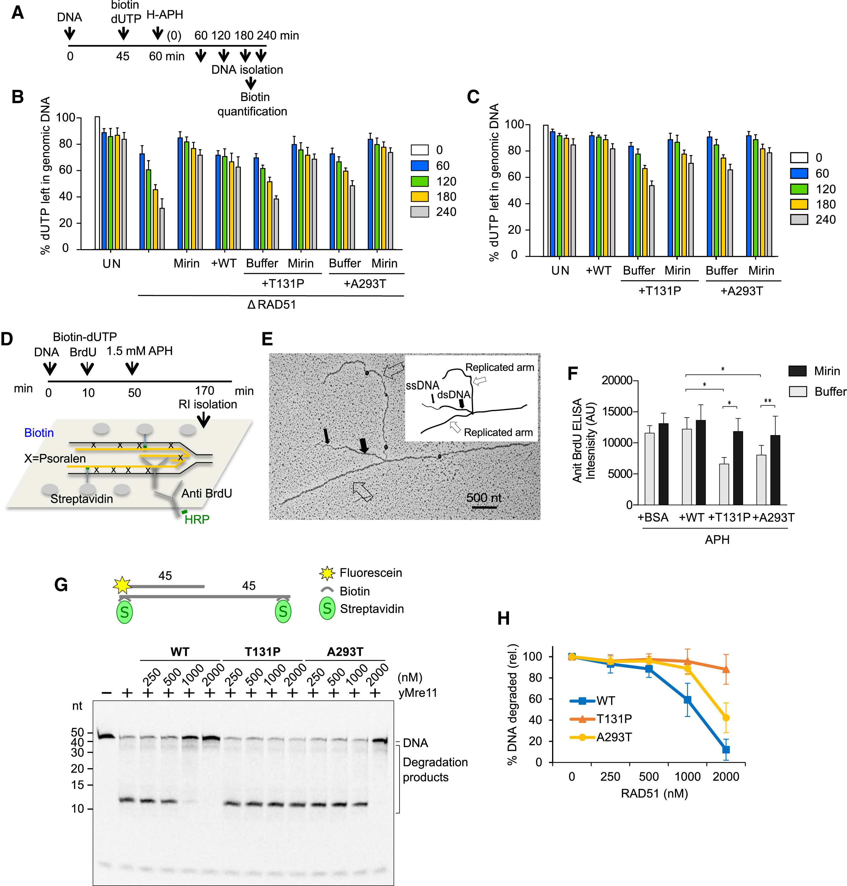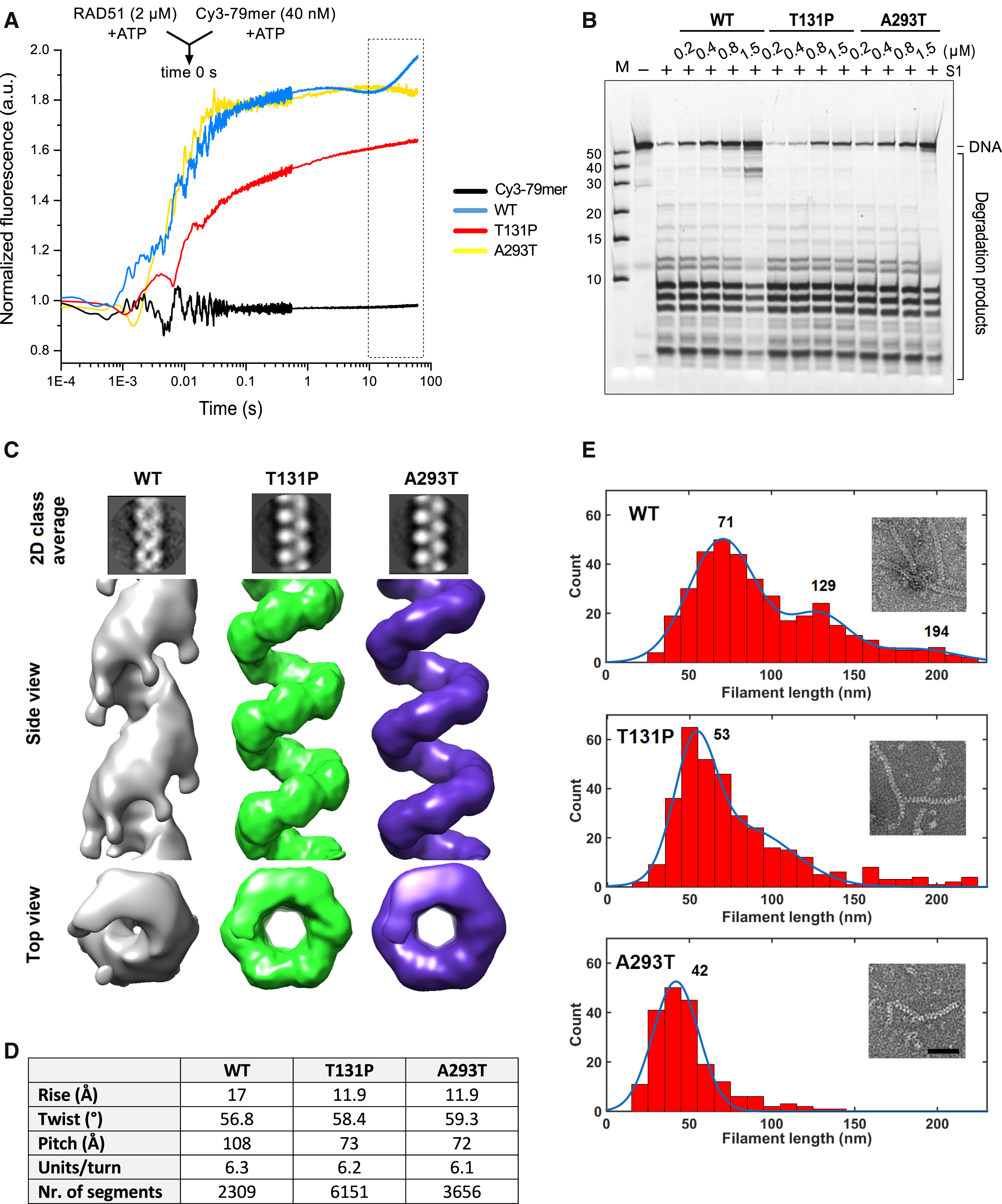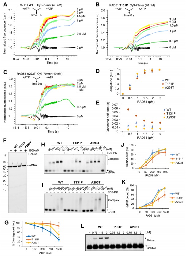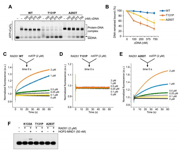 RAD51 WT (C), T131P (D), or A293T (E).