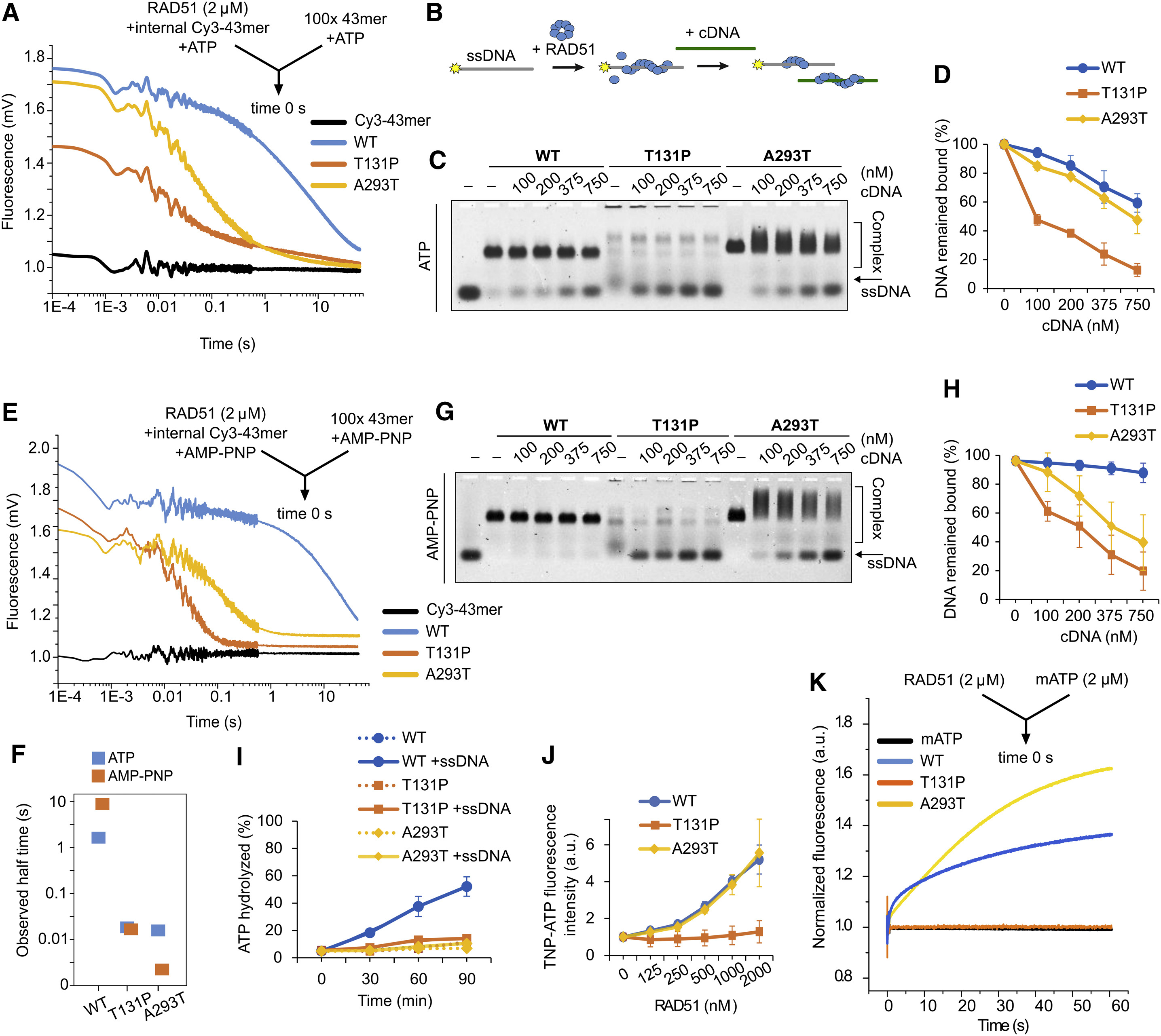 (K) Average normalized fluorescence of mATP in stopped flow upon rapid mixing with RAD51 in the presence of 10 mM MgCl2.