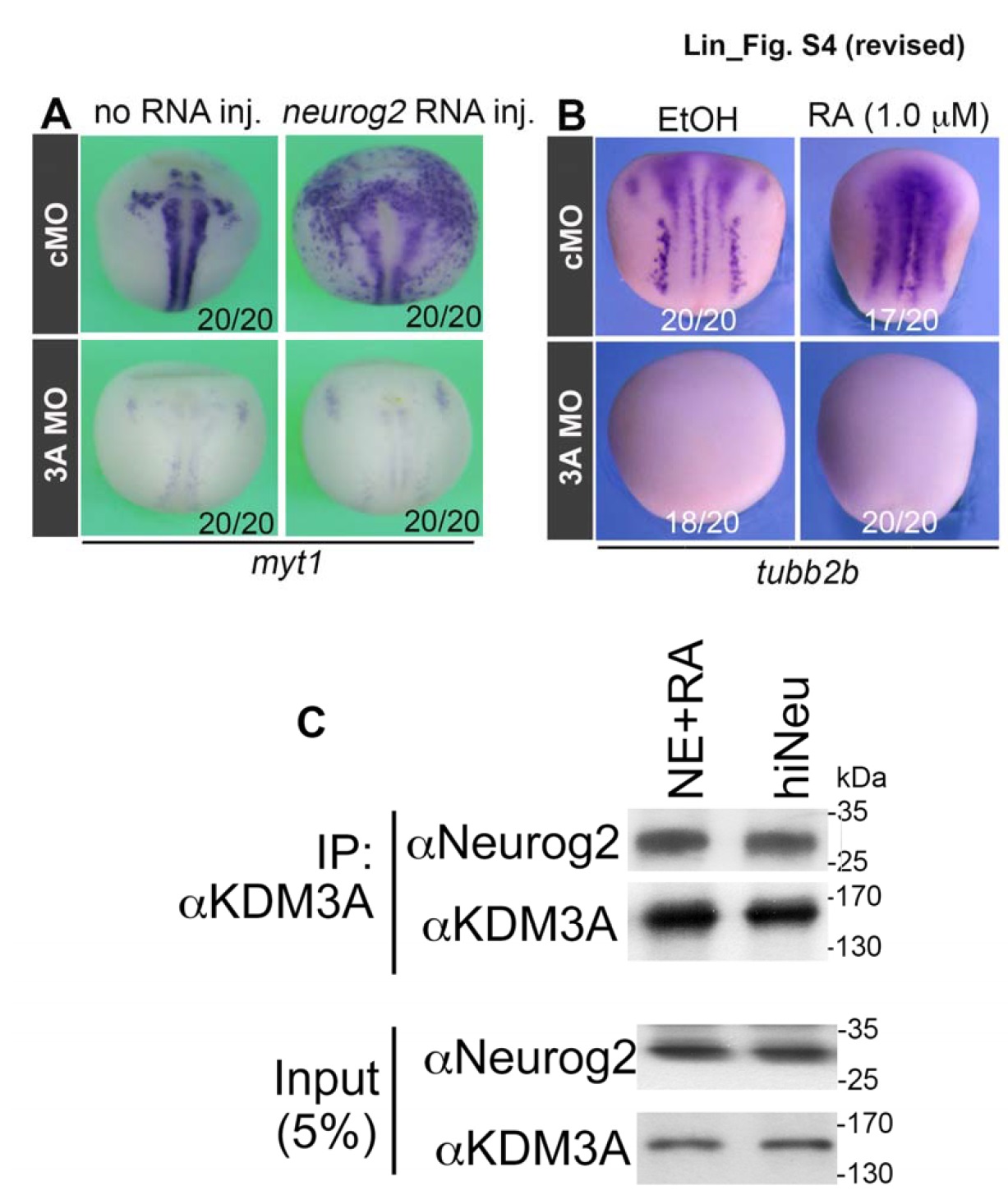 80 ng. neurog2 mRNA:100 pg. (B) Embryos at stage 15/16 in situ hybridized with tubb2b (dorsal view). 3A MO and cMO: 80 ng. RA (1.0 ïM) was added to culture