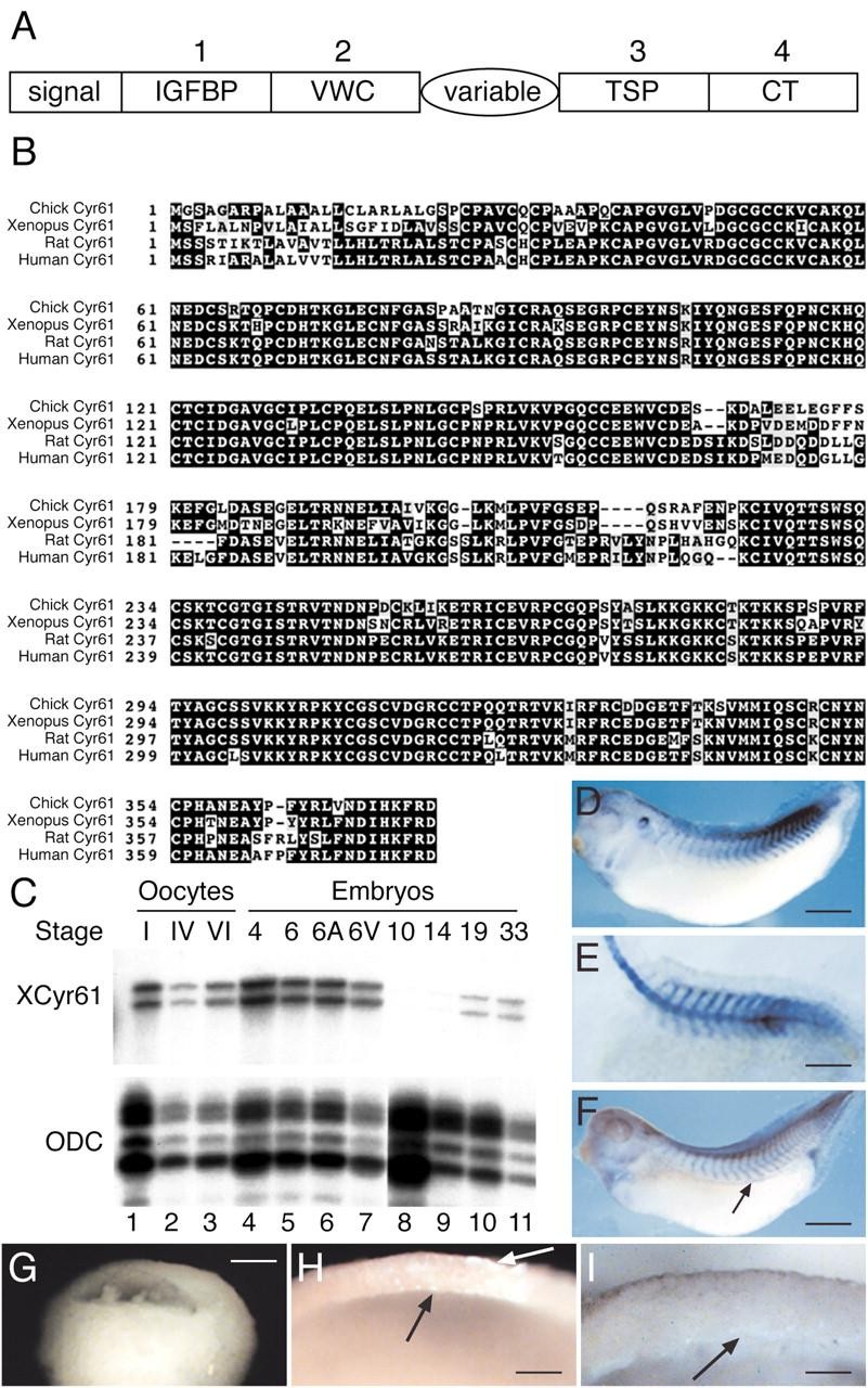 Fig. 1. Sequence and expression pattern of Xenopus Cyr61. (A) Domain structure of Cyr61. IGFBP, insulin growth factor binding protein domain; VWC, von Willebrand type C domain (also referred to as the cysteine rich domain of Chordin and short gastrulation); TSP, thrombospondin domain; CT, carboxy-terminal domain with homology to the neuronal pathfinding protein Slit. (B) Alignment of Cyr61 proteins from chick, Xenopus, rat and human. Note the high degree of conservation throughout the protein, except in the signal peptide and the variable central region. (C) Temporal expression pattern of Xcyr61 mRNA assessed by RNAase protection assay. Transcripts are present maternally and persist at least until early blastula stage 6, when they are present in both the animal (lane 6) and vegetal (lane 7) hemispheres of the embryo. Expression is then activated zygotically from mid-neurula stage 14 (lane 9). Ornithine decarboxylase (ODC) is used as a loading control. (D-F) Whole-mount in situ hybridisation analysis of Xcyr61 expression. At stage 28 (D), expression is detectable in the somites and branchial arches. A cleared embryo (E) reveals expression in the notochord, an observation that was confirmed in sectioned embryos (data not shown). At stage 34 (F), transcripts are present in the posterior cardinal vein (arrow). Sections of embryos such as these show that expression of Xcyr61 in the somites is concentrated in and around the nuclei, which suggests that transcripts are unstable (not shown). (G-I) Immunofluorescence analysis of the distribution of exogenous mouse Cyr61 in Xenopus gastrulae. (G) An uninjected embryo at early gastrula stage 10 does not react with a mouse Cyr61 antiserum. (H) An embryo previously injected with RNA encoding mouse Cyr61 reveals accumulation of mCyr61 in the blastocoel roof at the early gastrula stage (arrows). (I) Xenopus fibronectin also accumulates in the blastocoel roof (arrow). Note that expression of Xcyr61 during gastrulation proper is very low; this suggests that our morpholino oligonucleotides (Fig. 3) are targetting translation of maternal Xcyr61 mRNA. Scale bars: D, 0.4 mm; E, 0.25 mm; F, 0.4 mm; G, 0.25 mm; H, 80 μm; I, 40μ m.